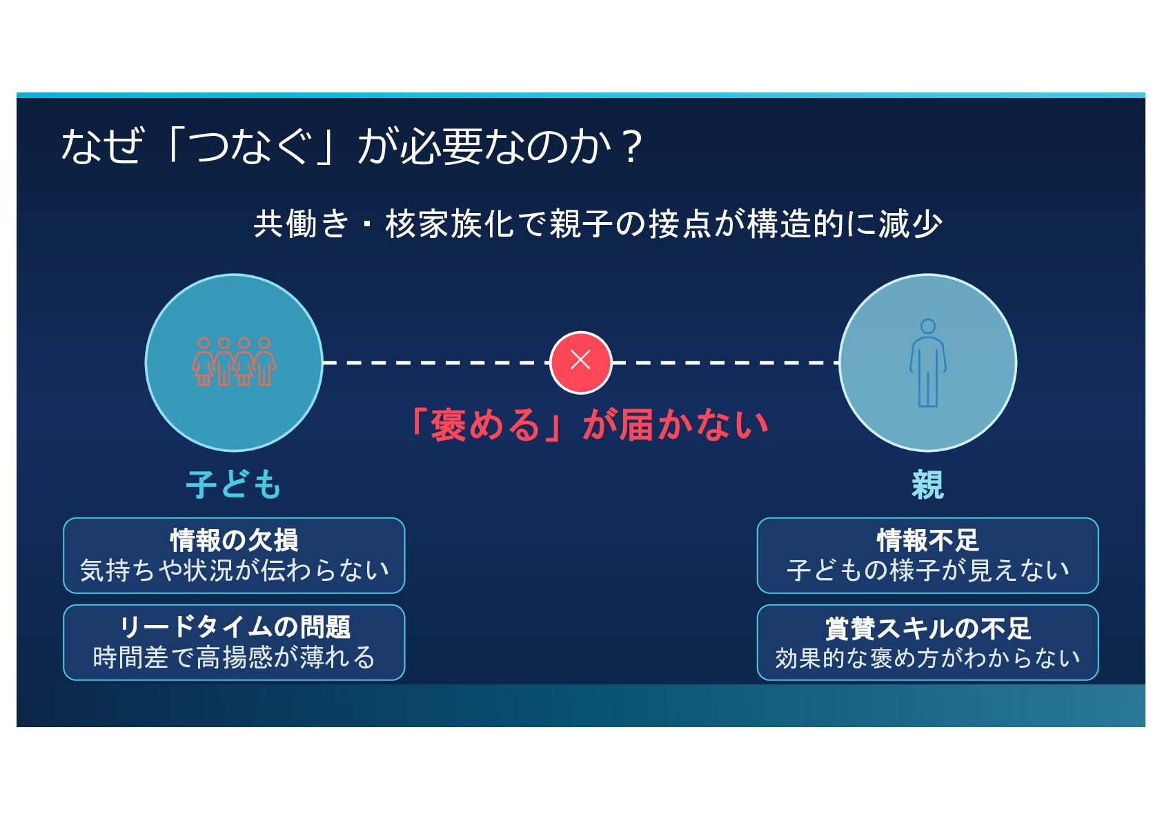 なぜ「つなぐ」が必要なのか︖ 共働き・核家族化で親子の接点が構造的に減少 子ども 親 ✕ 「褒める」が届かない 情報の欠損 気持ちや状況が伝わらない リードタイムの問題 時間差で高揚感が薄れる