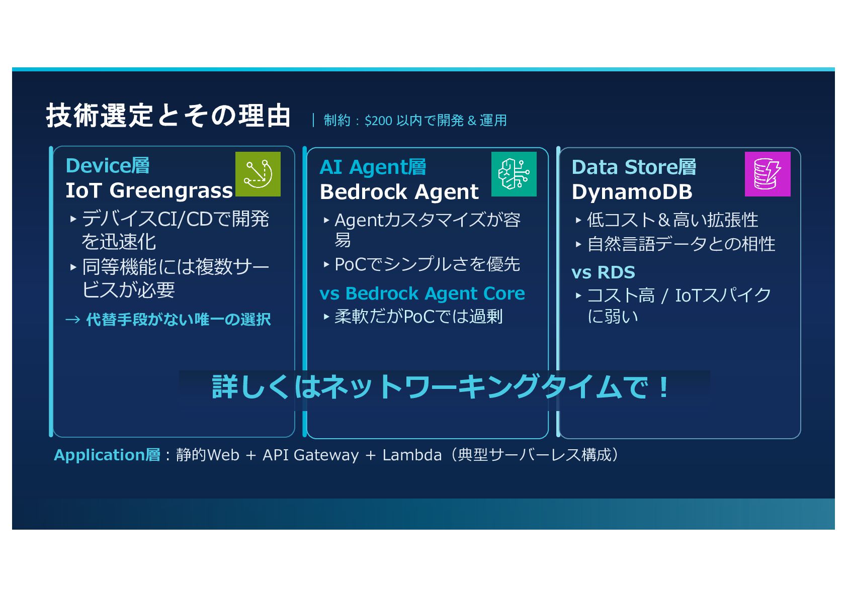 を迅速化 ▸同等機能には複数サー ビスが必要 → 代替⼿段がない唯⼀の選択 AI Agent層 Bedrock Agent ▸Agentカスタマイズが容 易 ▸PoCでシンプルさを優先 vs Bedrock Agent Core ▸柔軟だがPoCでは過剰 Data Store層 DynamoDB ▸低コスト&⾼い拡張性 ▸⾃然⾔語データとの相性 vs RDS ▸コスト⾼ / IoTスパイク に弱い Application層︓静的Web + API Gateway + Lambda(典型サーバーレス構成) 詳しくはネットワーキングタイムで︕