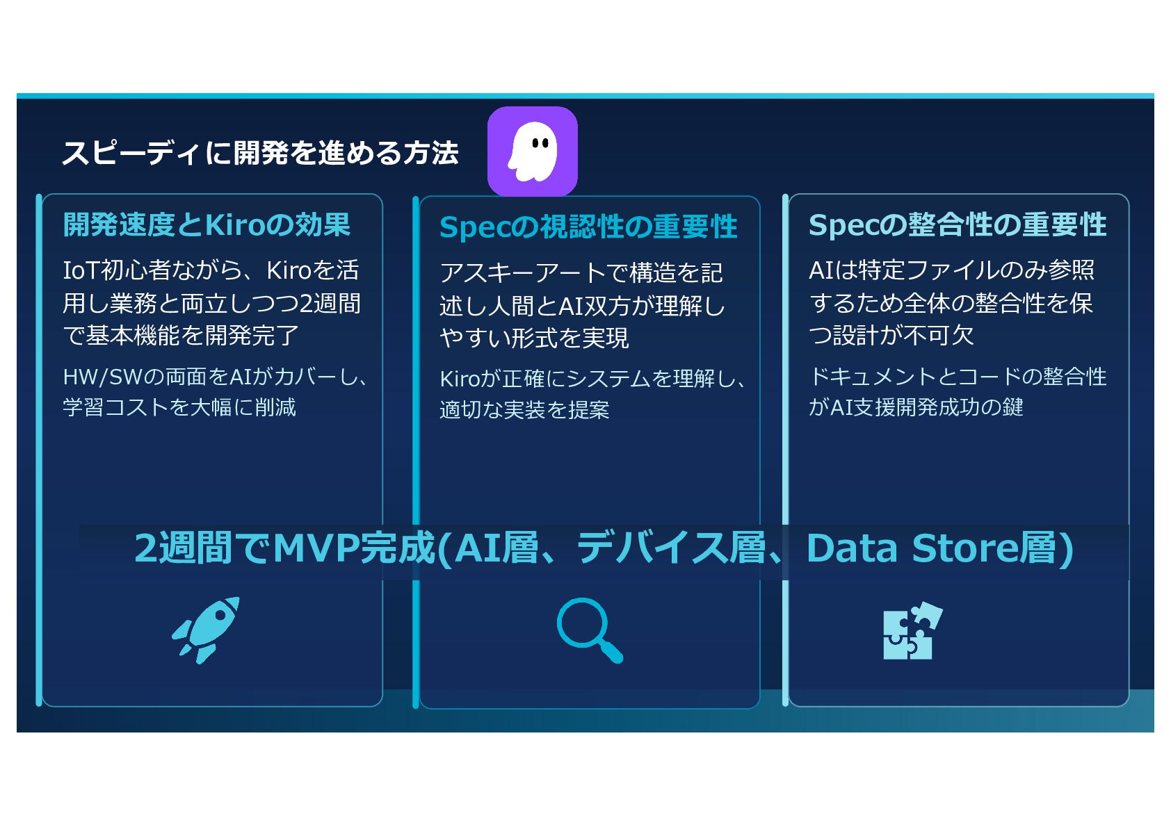 で基本機能を開発完了 HW/SWの両⾯をAIがカバーし、 学習コストを⼤幅に削減 Specの整合性の重要性 AIは特定ファイルのみ参照 するため全体の整合性を保 つ設計が不可⽋ ドキュメントとコードの整合性 がAI⽀援開発成功の鍵 2週間でMVP完成(AI層、デバイス層、Data Store層)