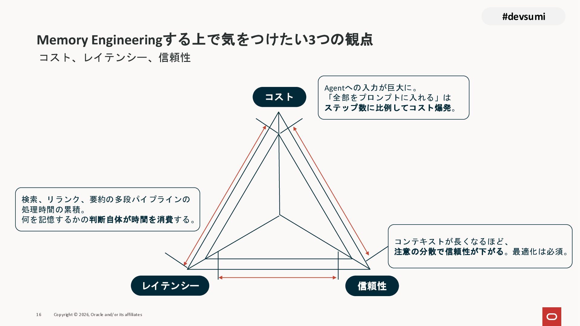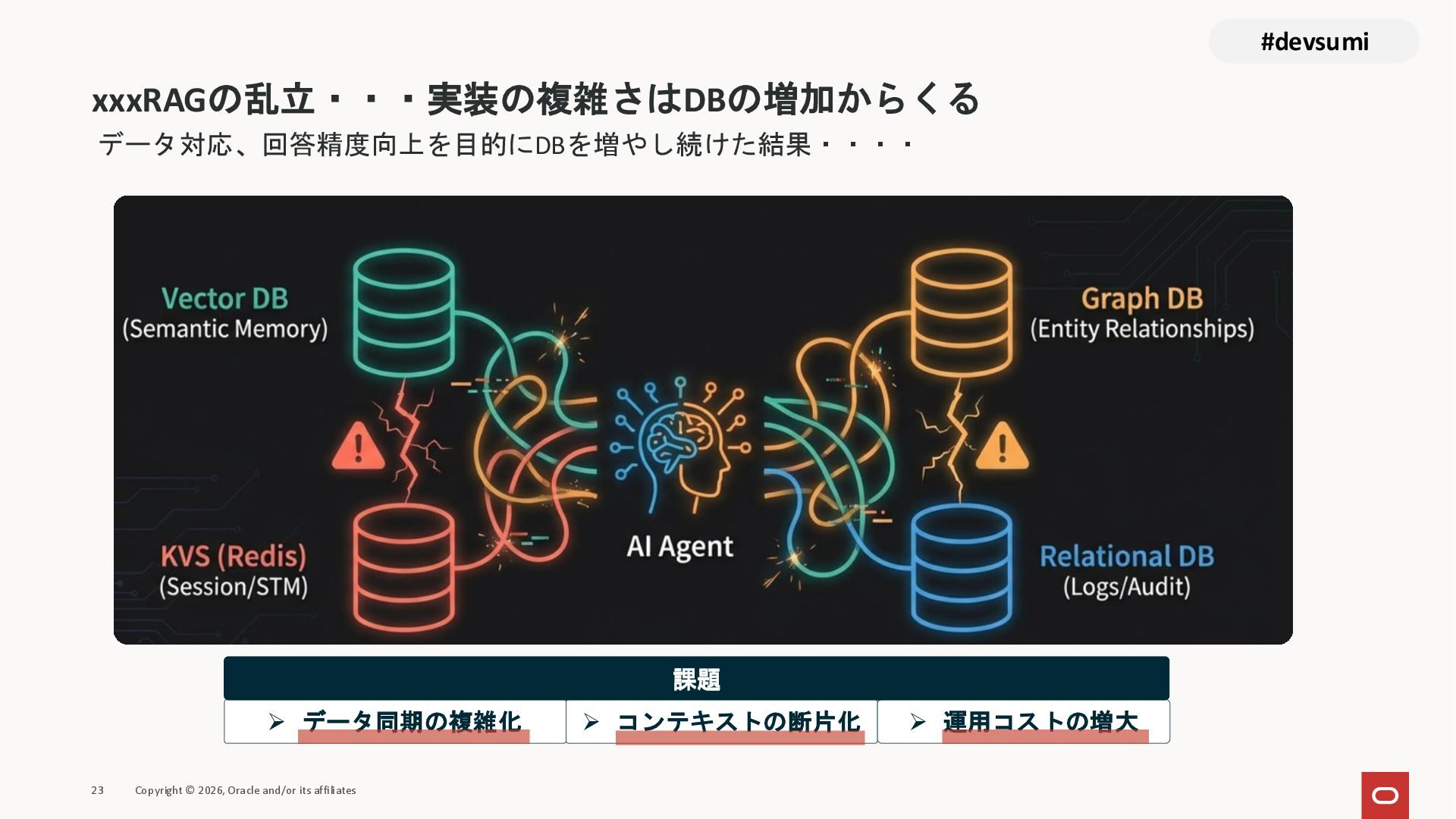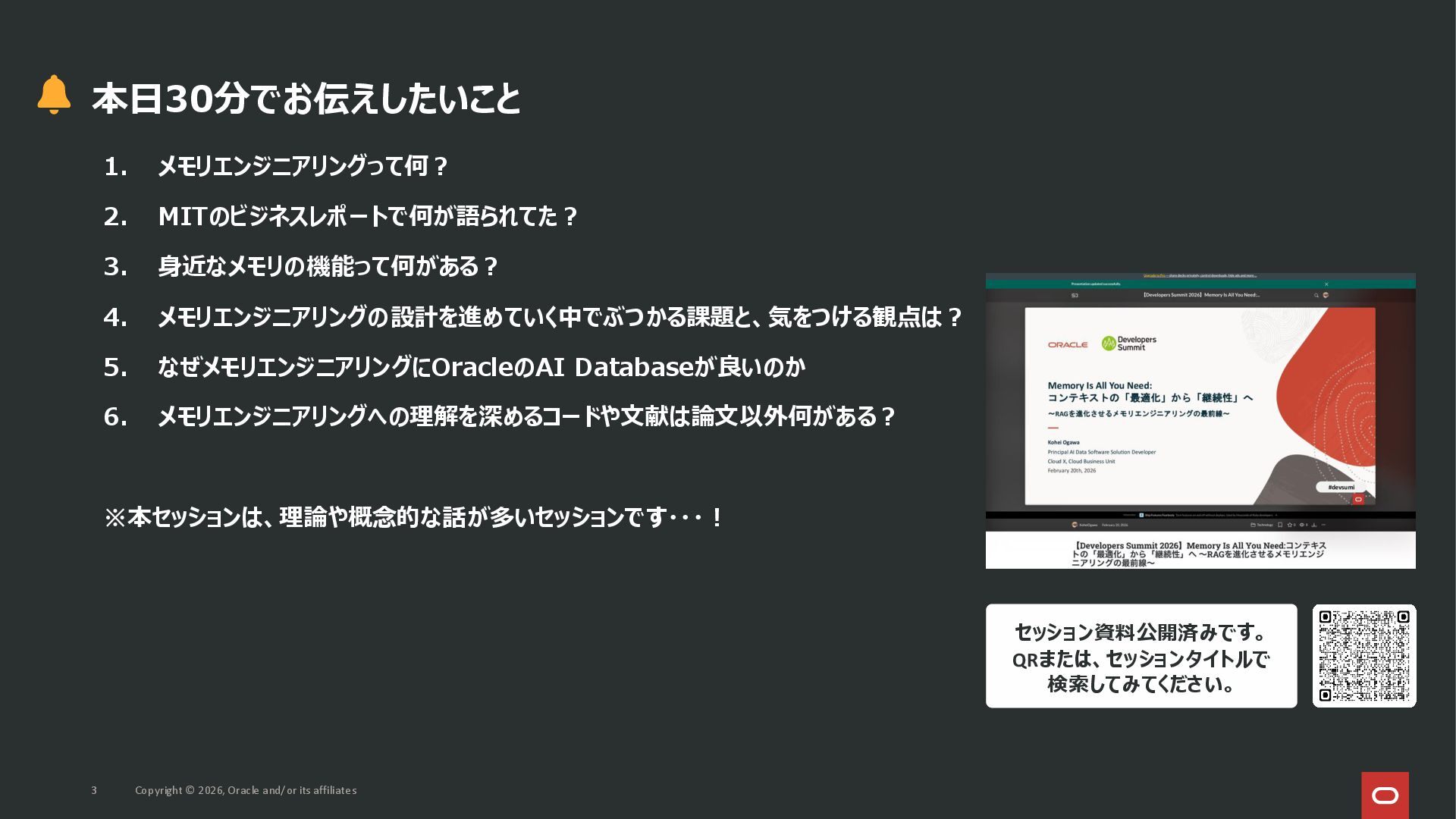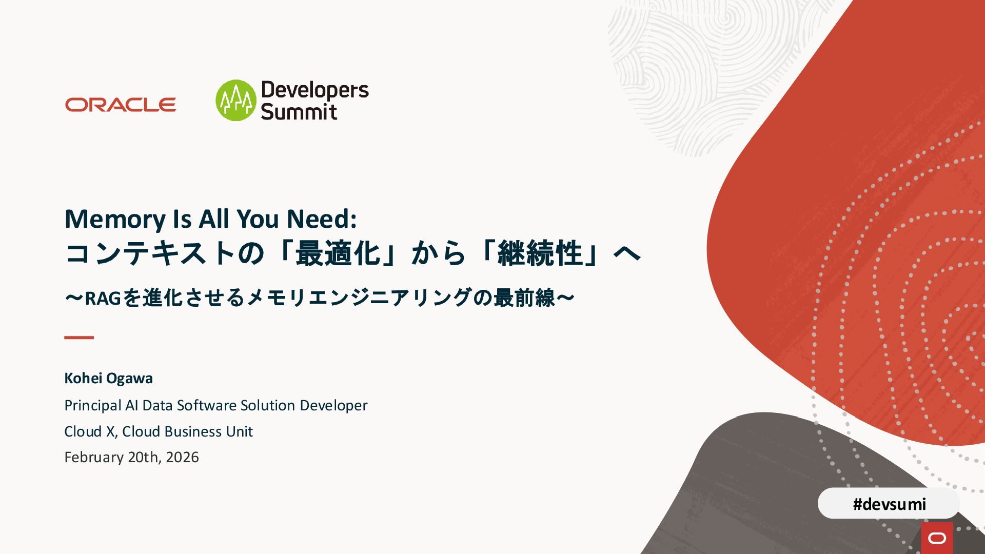 本セッションでは、最新のメモリ領域に関する研究論文を紹介しつつ、アプリケーションエンジニアが実際に直面する 「実装の複雑さ」 に踏み込みます。短期記憶、長期記憶、スキル管理、目的別に派生した各種 xxxRAG のために、用途ごとに異なるデータベースを乱立させる必要はありません。Oracle AI Database を 「Memory Core」 と位置づけ、単一のデータベース上であらゆるメモリ領域を統合・管理することで、エンタープライズ企業で運用可能なAI Agentを構築するアーキテクチャを具体的に解説します。