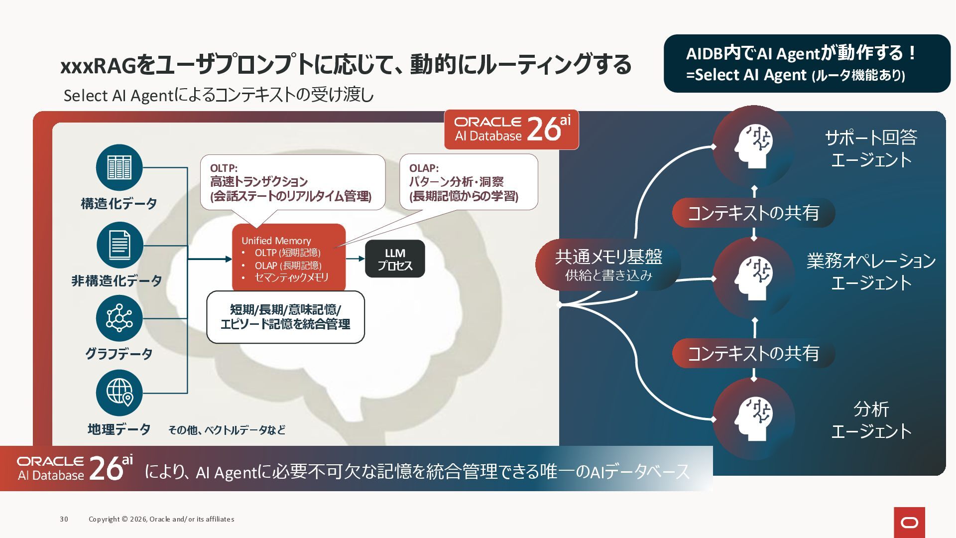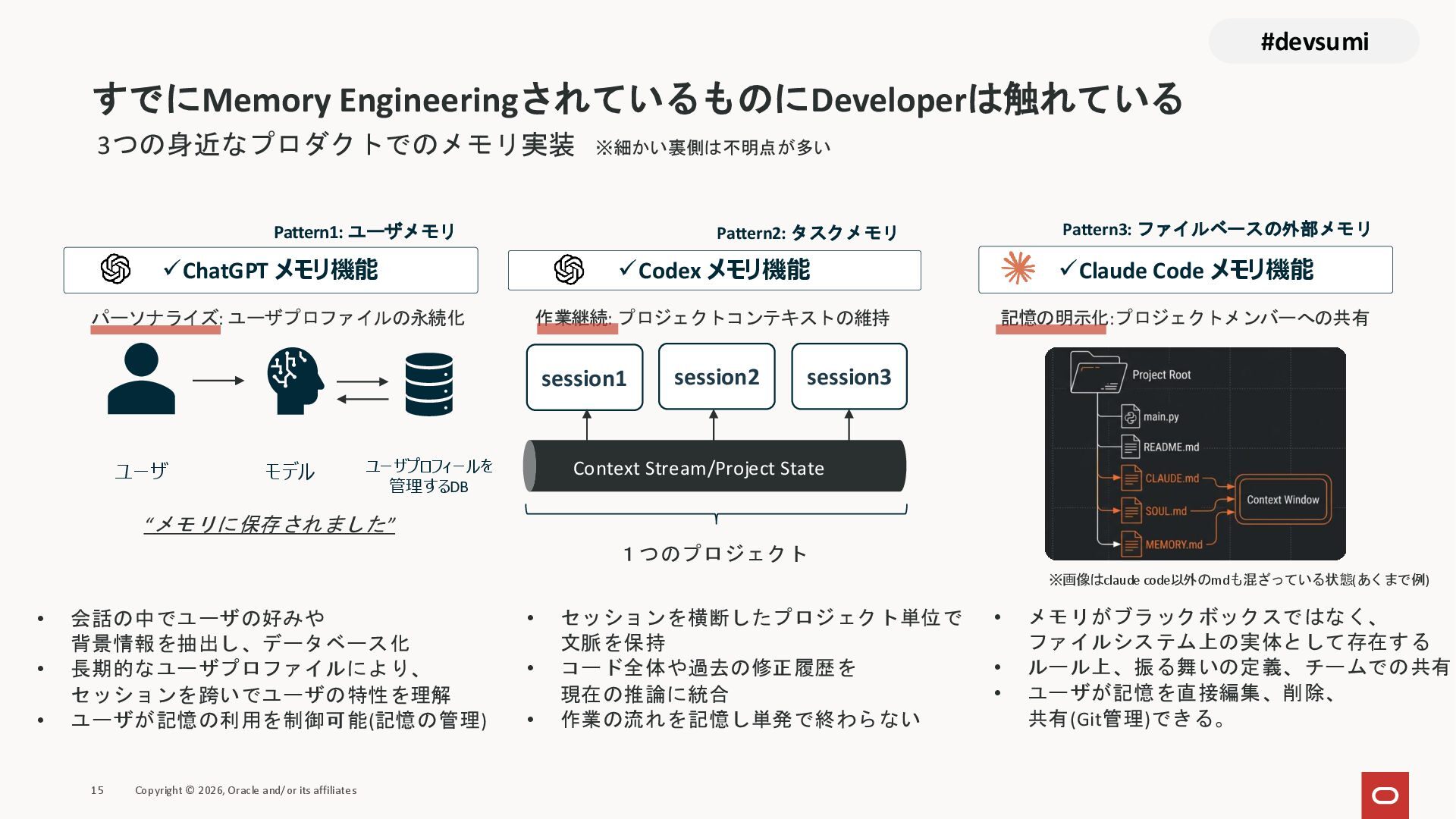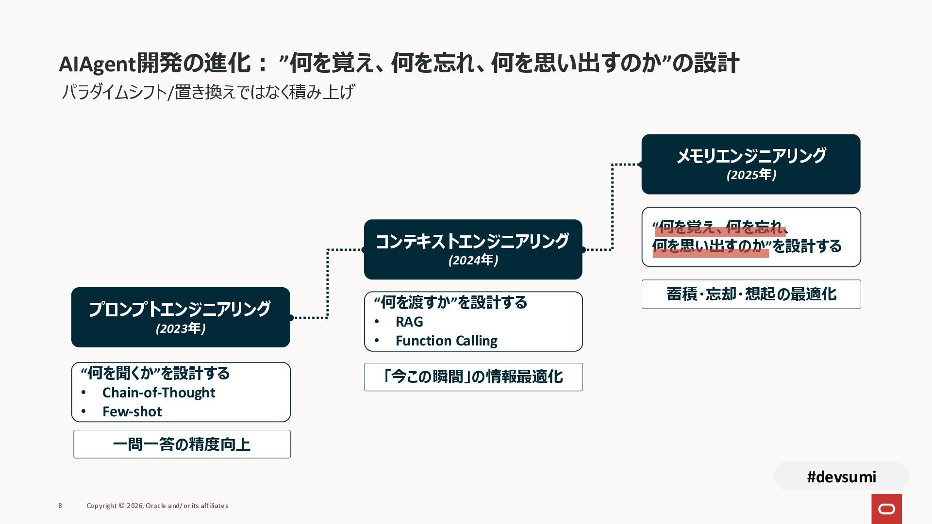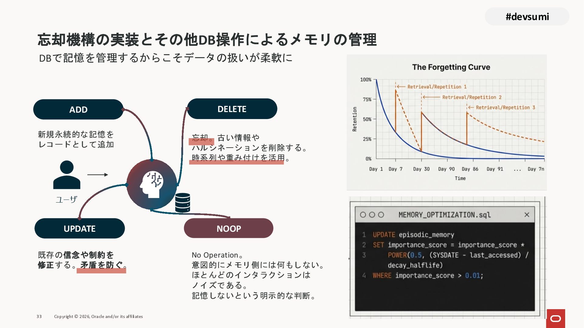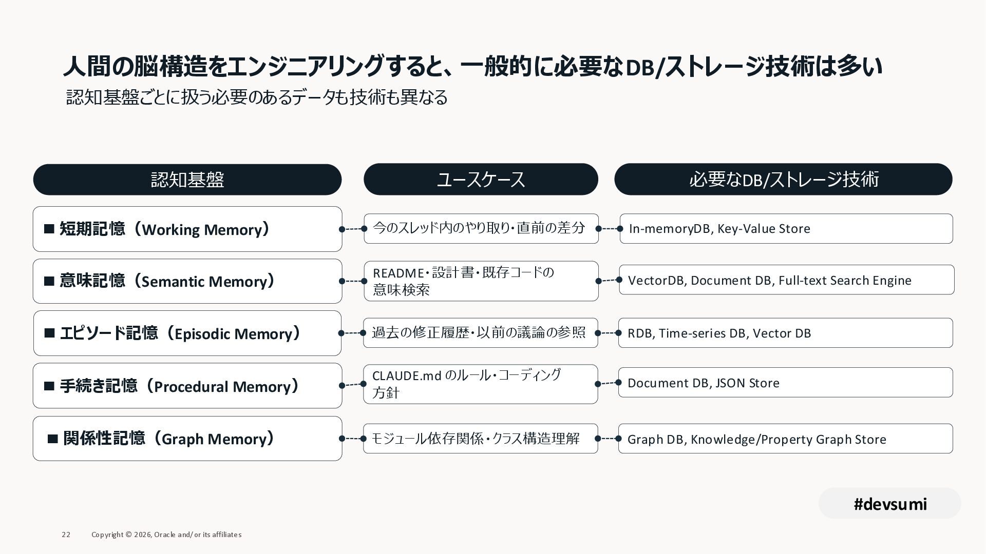 本セッションでは、最新のメモリ領域に関する研究論文を紹介しつつ、アプリケーションエンジニアが実際に直面する 「実装の複雑さ」 に踏み込みます。短期記憶、長期記憶、スキル管理、目的別に派生した各種 xxxRAG のために、用途ごとに異なるデータベースを乱立させる必要はありません。Oracle AI Database を 「Memory Core」 と位置づけ、単一のデータベース上であらゆるメモリ領域を統合・管理することで、エンタープライズ企業で運用可能なAI Agentを構築するアーキテクチャを具体的に解説します。
