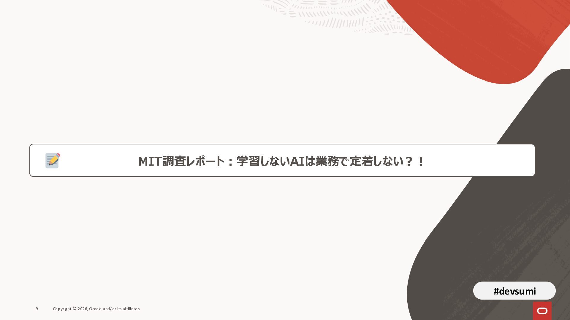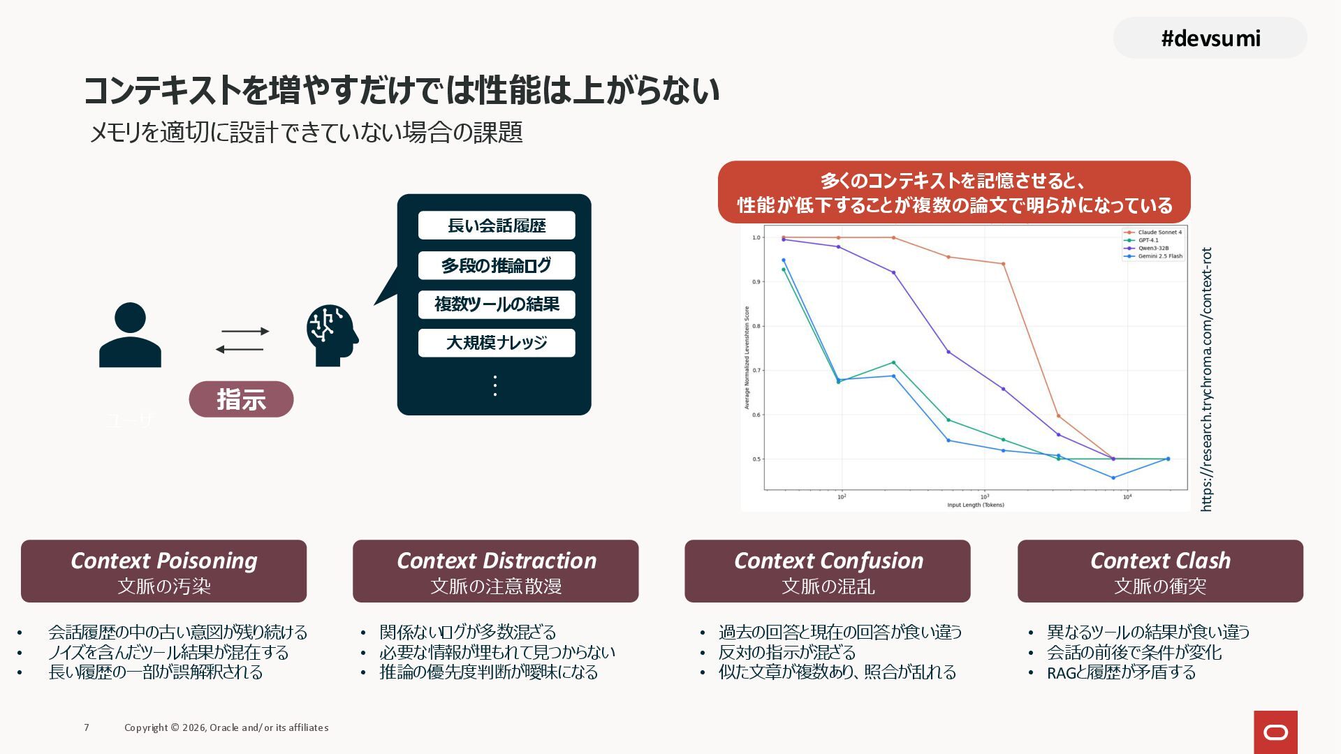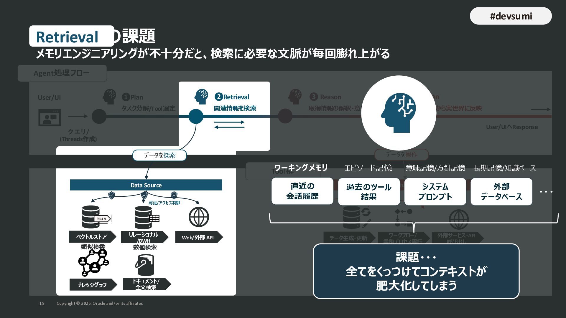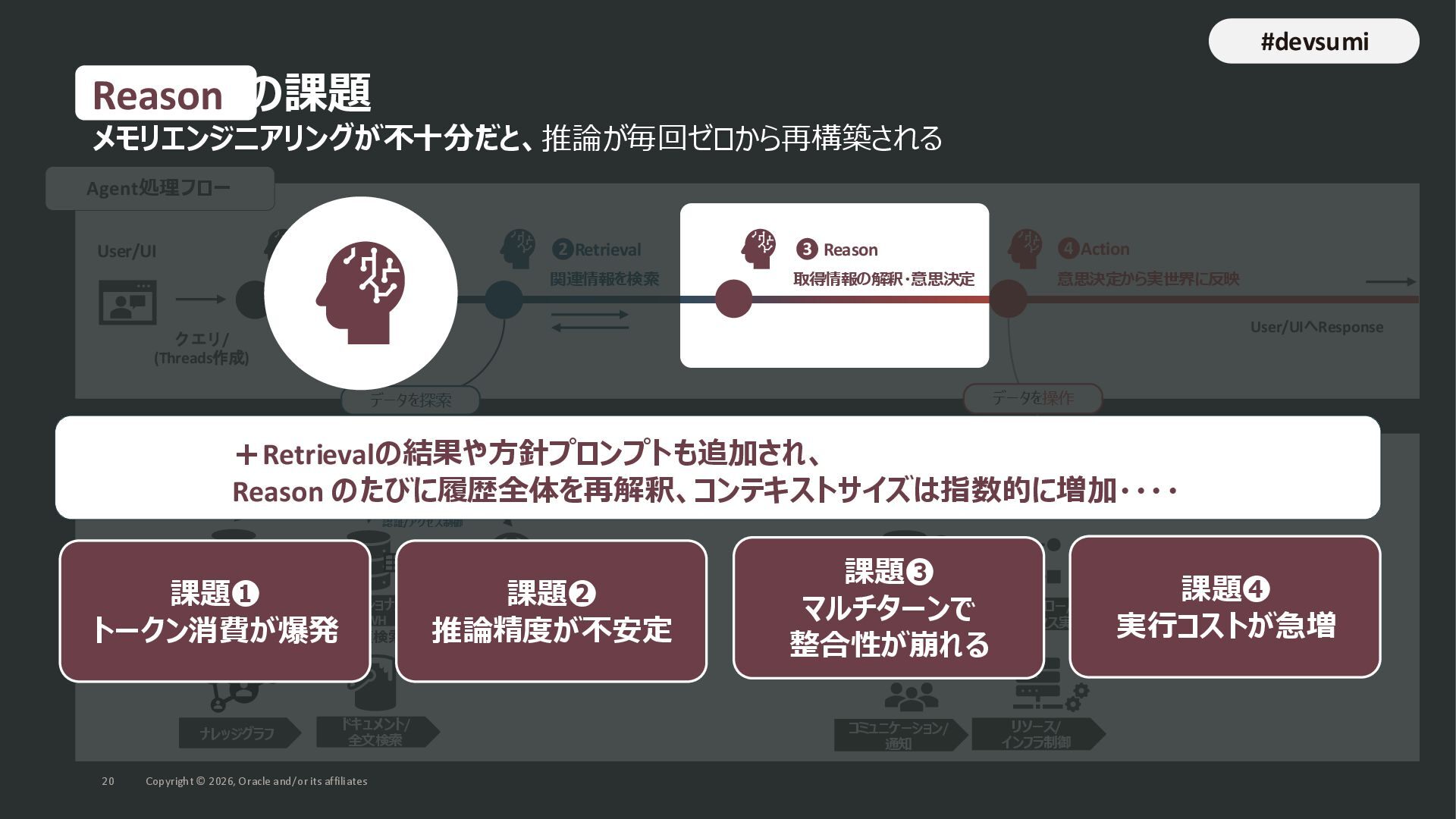 本セッションでは、最新のメモリ領域に関する研究論文を紹介しつつ、アプリケーションエンジニアが実際に直面する 「実装の複雑さ」 に踏み込みます。短期記憶、長期記憶、スキル管理、目的別に派生した各種 xxxRAG のために、用途ごとに異なるデータベースを乱立させる必要はありません。Oracle AI Database を 「Memory Core」 と位置づけ、単一のデータベース上であらゆるメモリ領域を統合・管理することで、エンタープライズ企業で運用可能なAI Agentを構築するアーキテクチャを具体的に解説します。