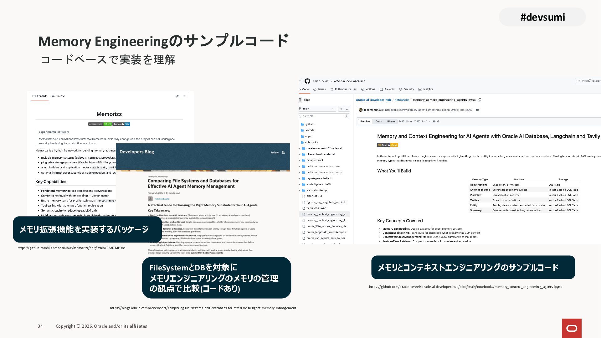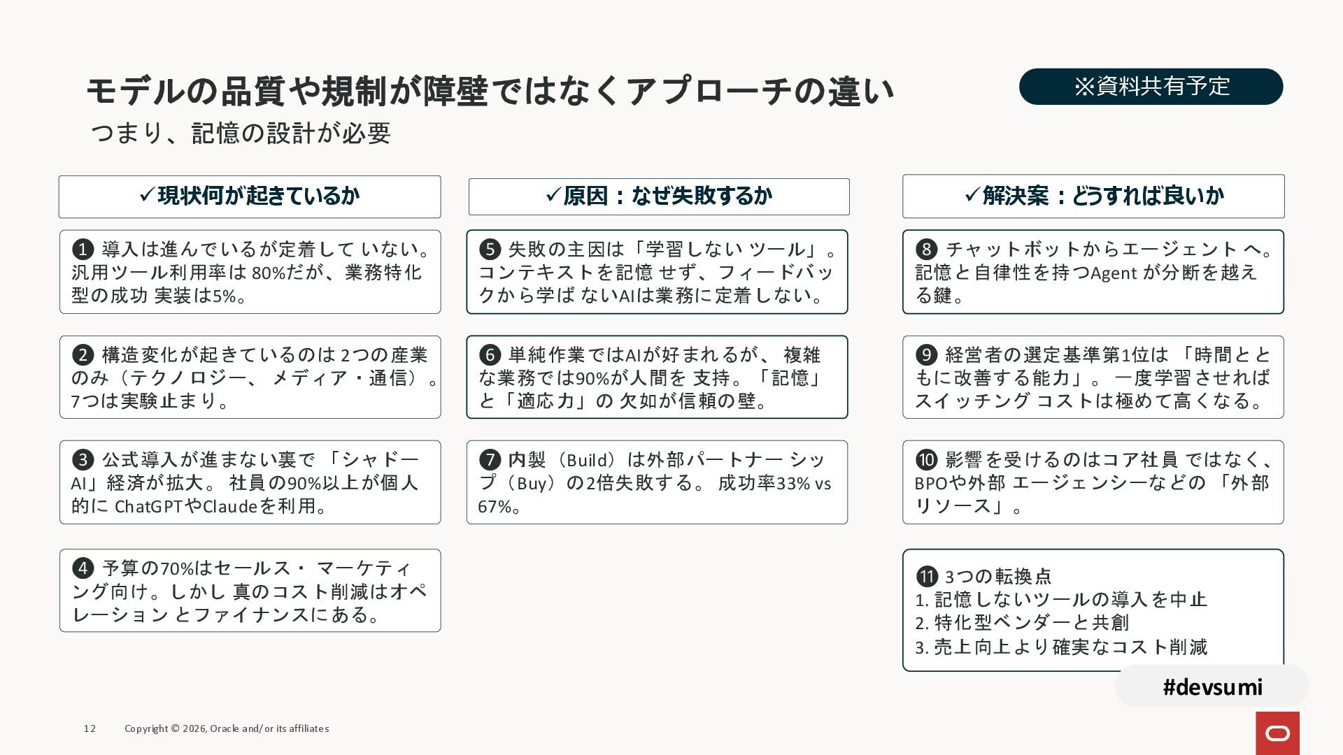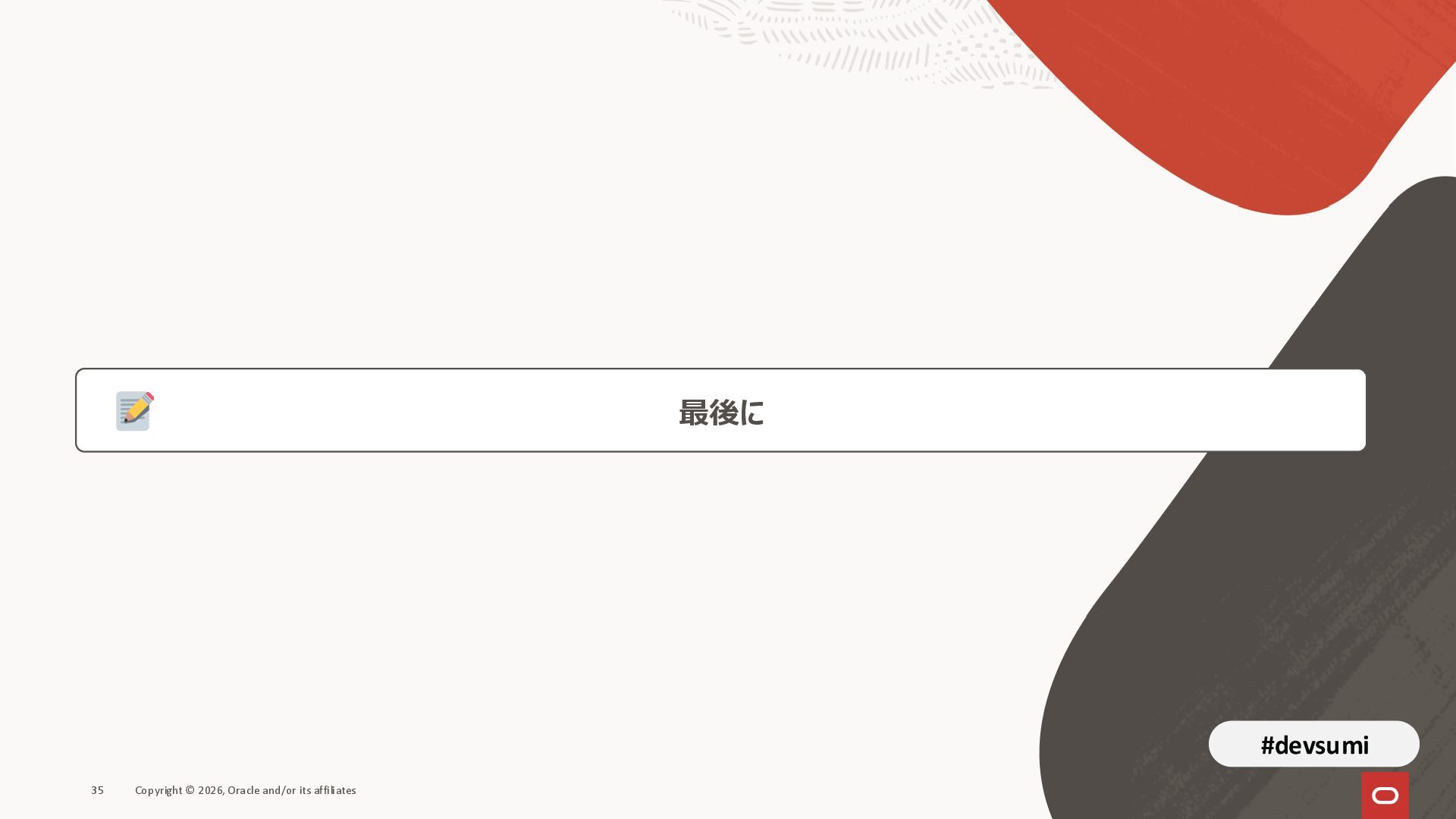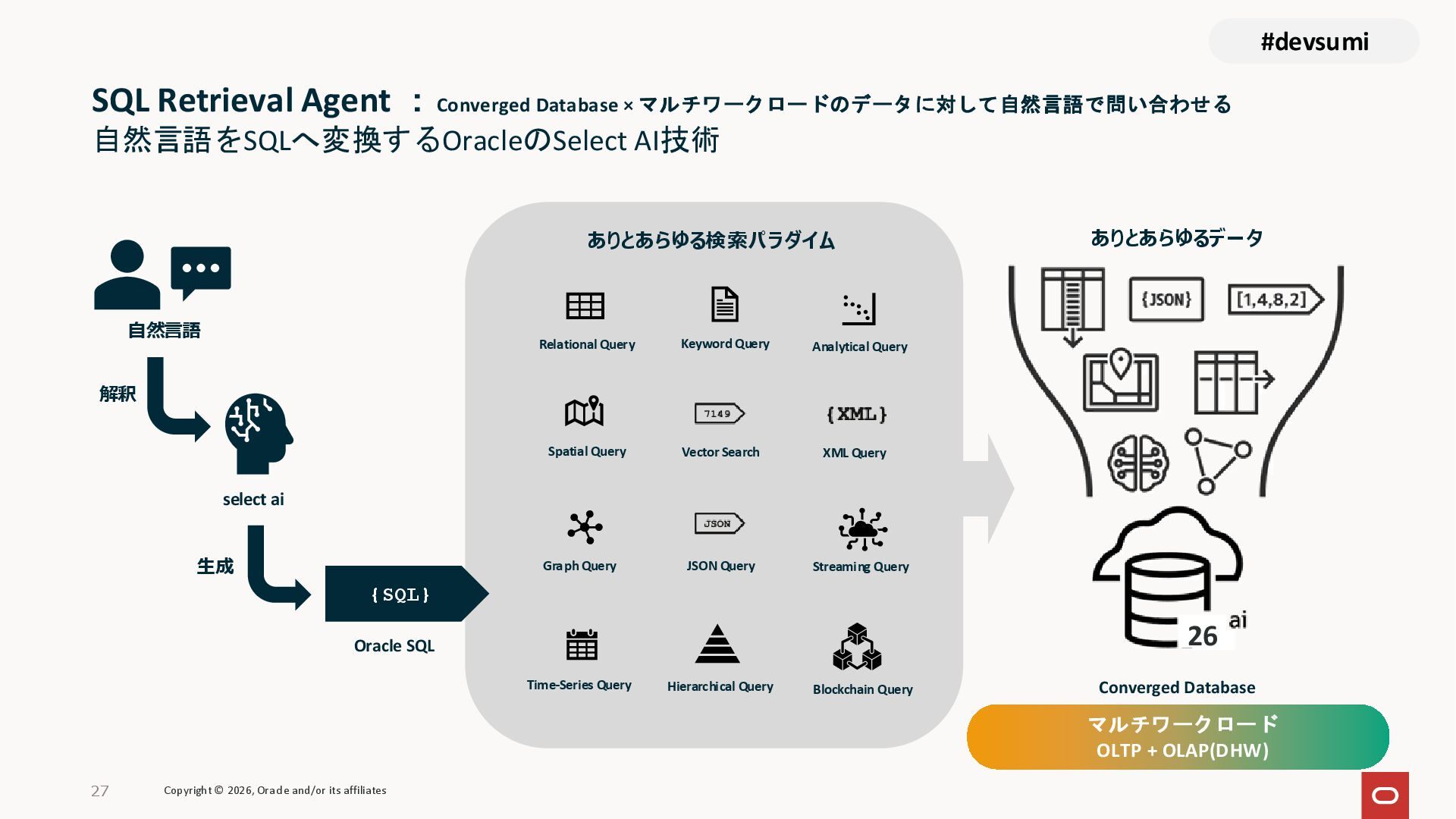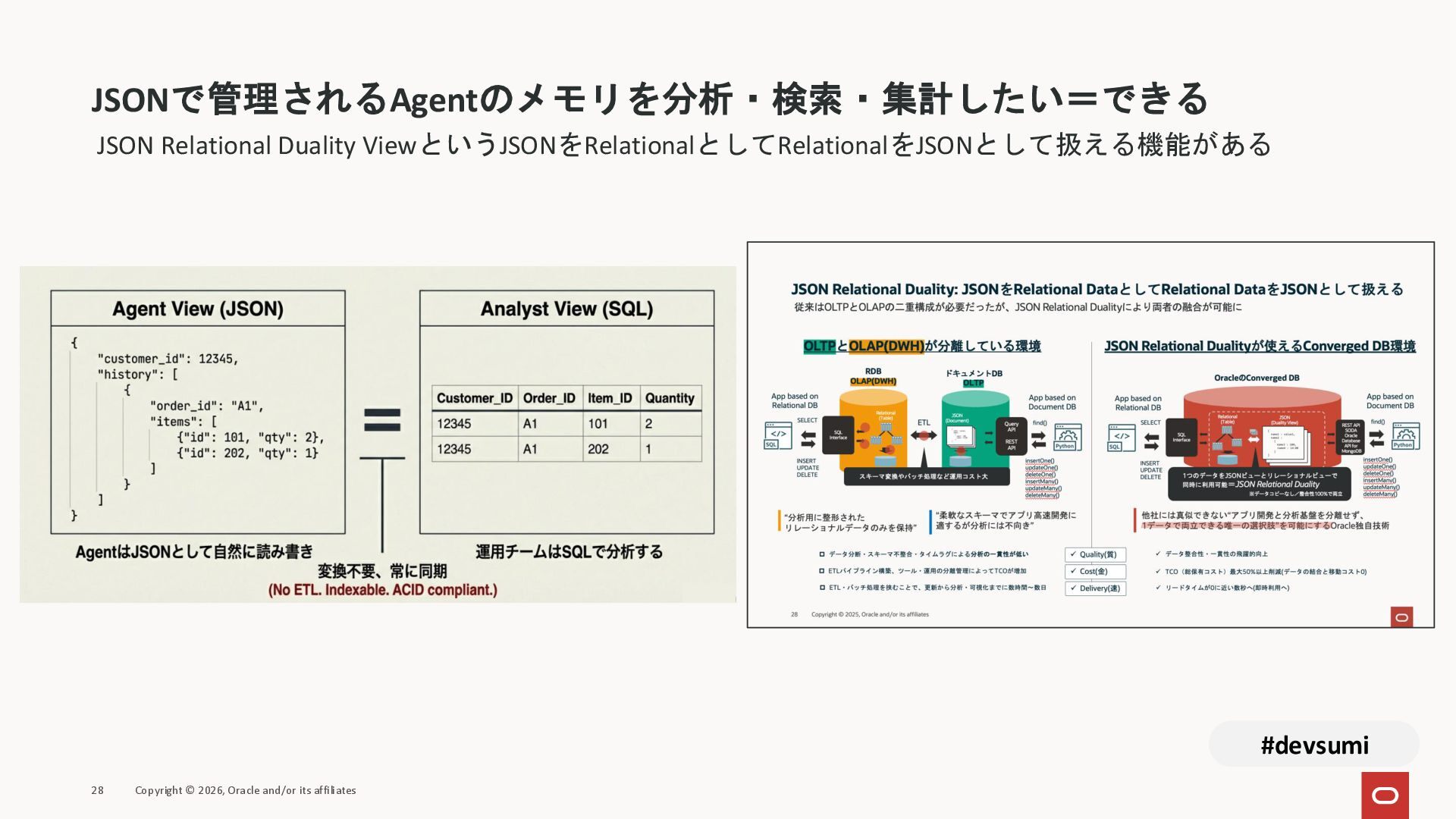 本セッションでは、最新のメモリ領域に関する研究論文を紹介しつつ、アプリケーションエンジニアが実際に直面する 「実装の複雑さ」 に踏み込みます。短期記憶、長期記憶、スキル管理、目的別に派生した各種 xxxRAG のために、用途ごとに異なるデータベースを乱立させる必要はありません。Oracle AI Database を 「Memory Core」 と位置づけ、単一のデータベース上であらゆるメモリ領域を統合・管理することで、エンタープライズ企業で運用可能なAI Agentを構築するアーキテクチャを具体的に解説します。