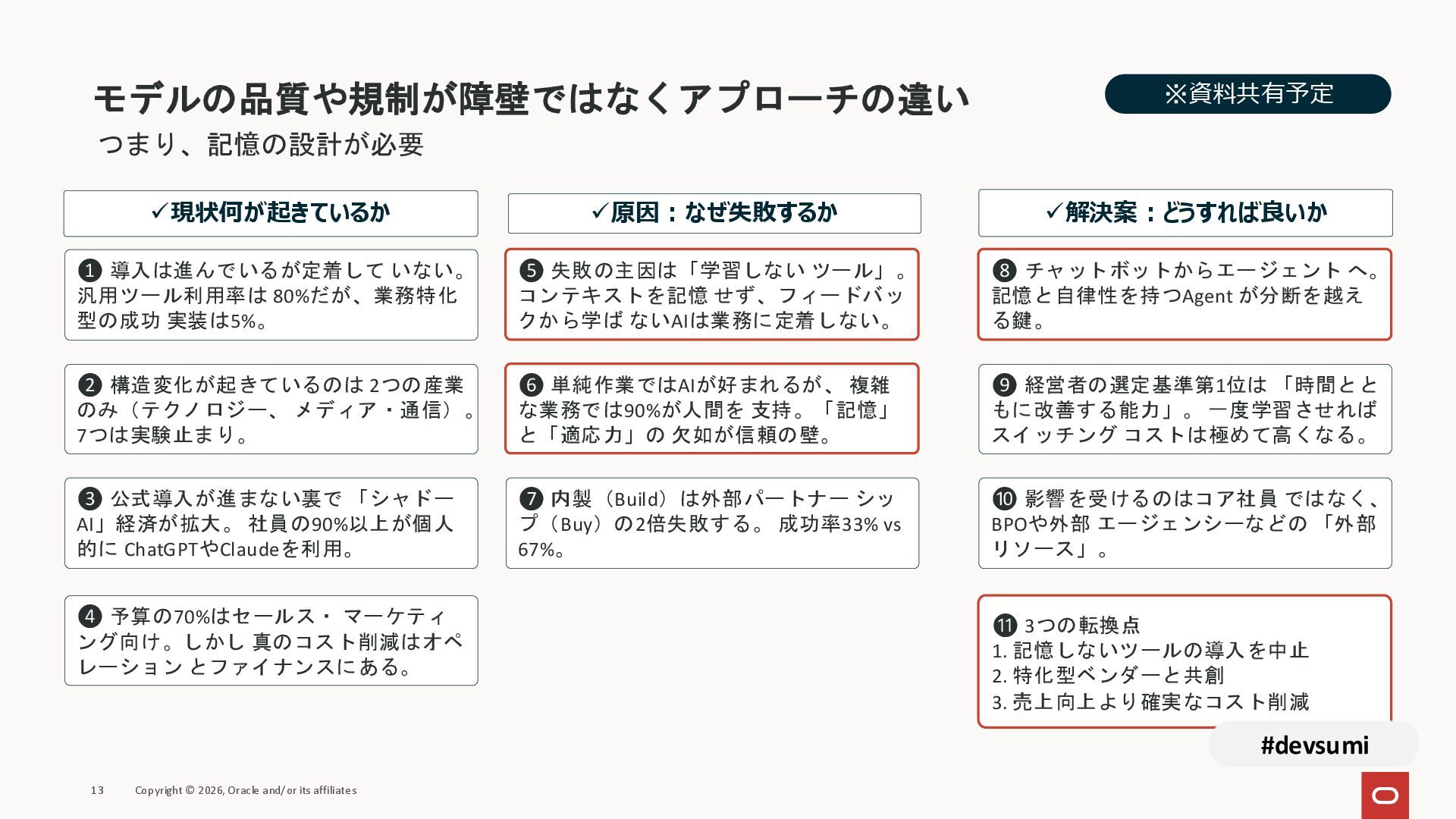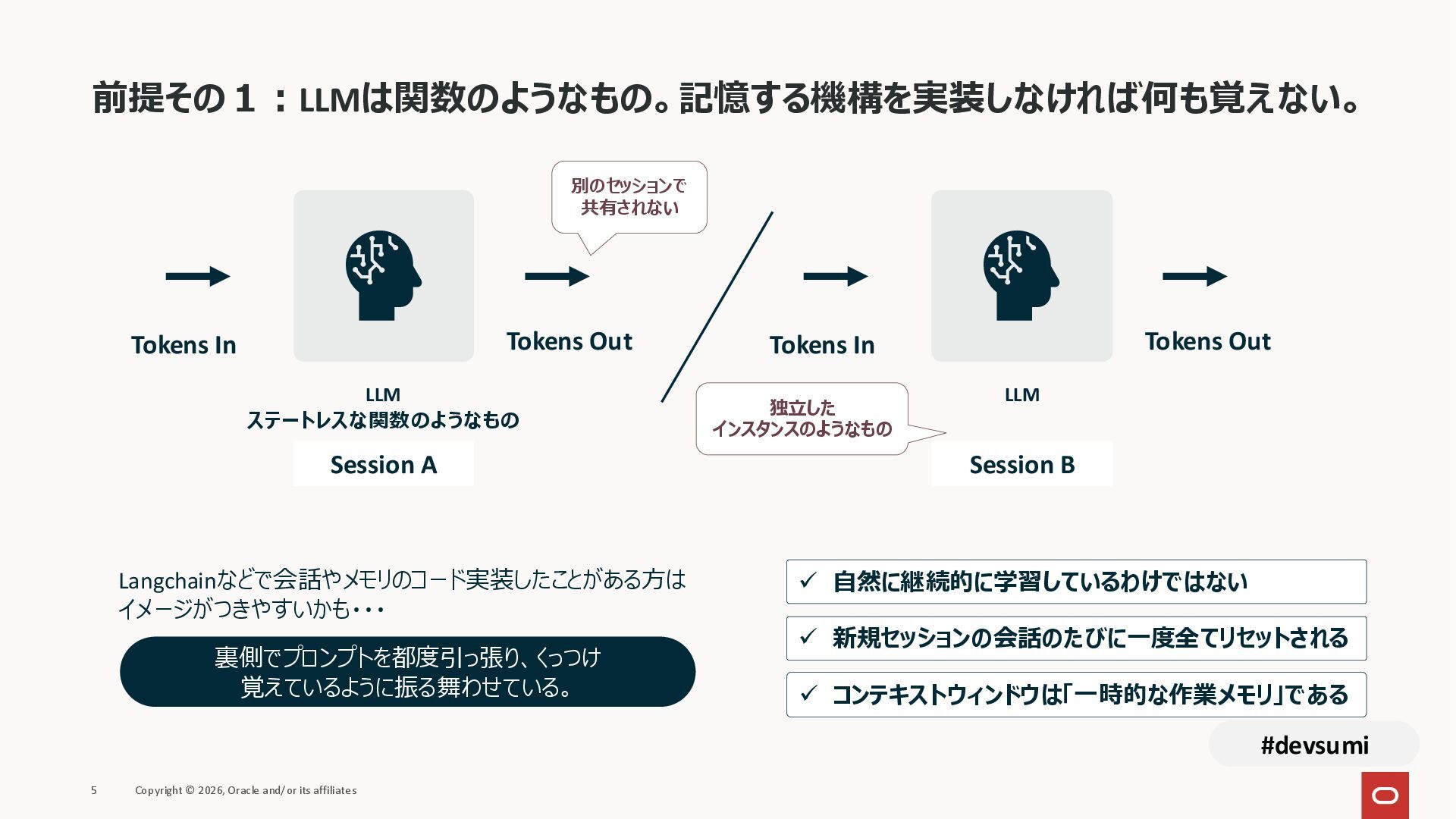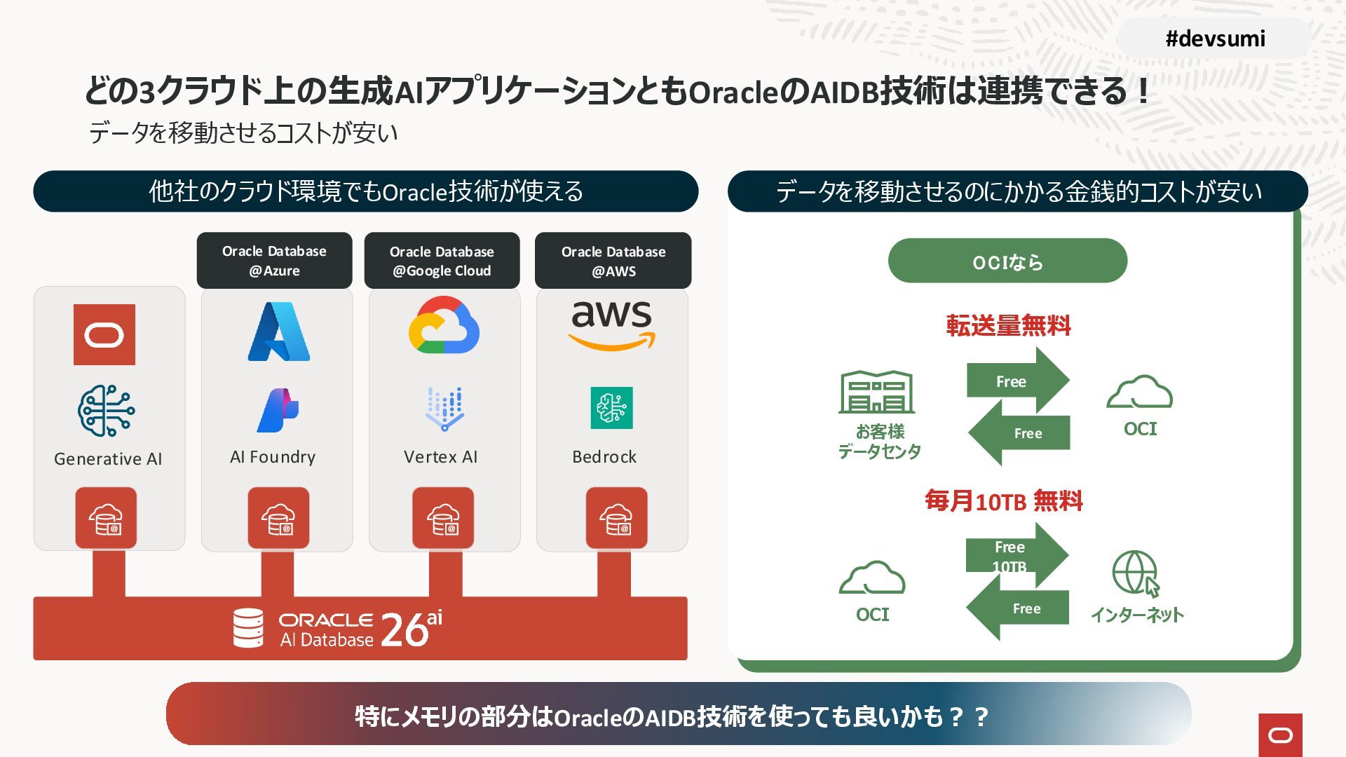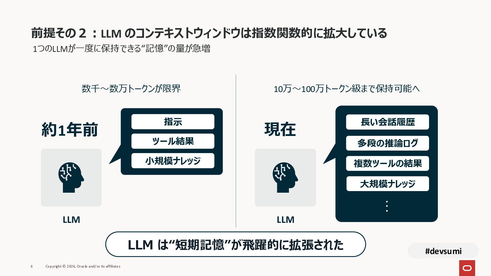 本セッションでは、最新のメモリ領域に関する研究論文を紹介しつつ、アプリケーションエンジニアが実際に直面する 「実装の複雑さ」 に踏み込みます。短期記憶、長期記憶、スキル管理、目的別に派生した各種 xxxRAG のために、用途ごとに異なるデータベースを乱立させる必要はありません。Oracle AI Database を 「Memory Core」 と位置づけ、単一のデータベース上であらゆるメモリ領域を統合・管理することで、エンタープライズ企業で運用可能なAI Agentを構築するアーキテクチャを具体的に解説します。