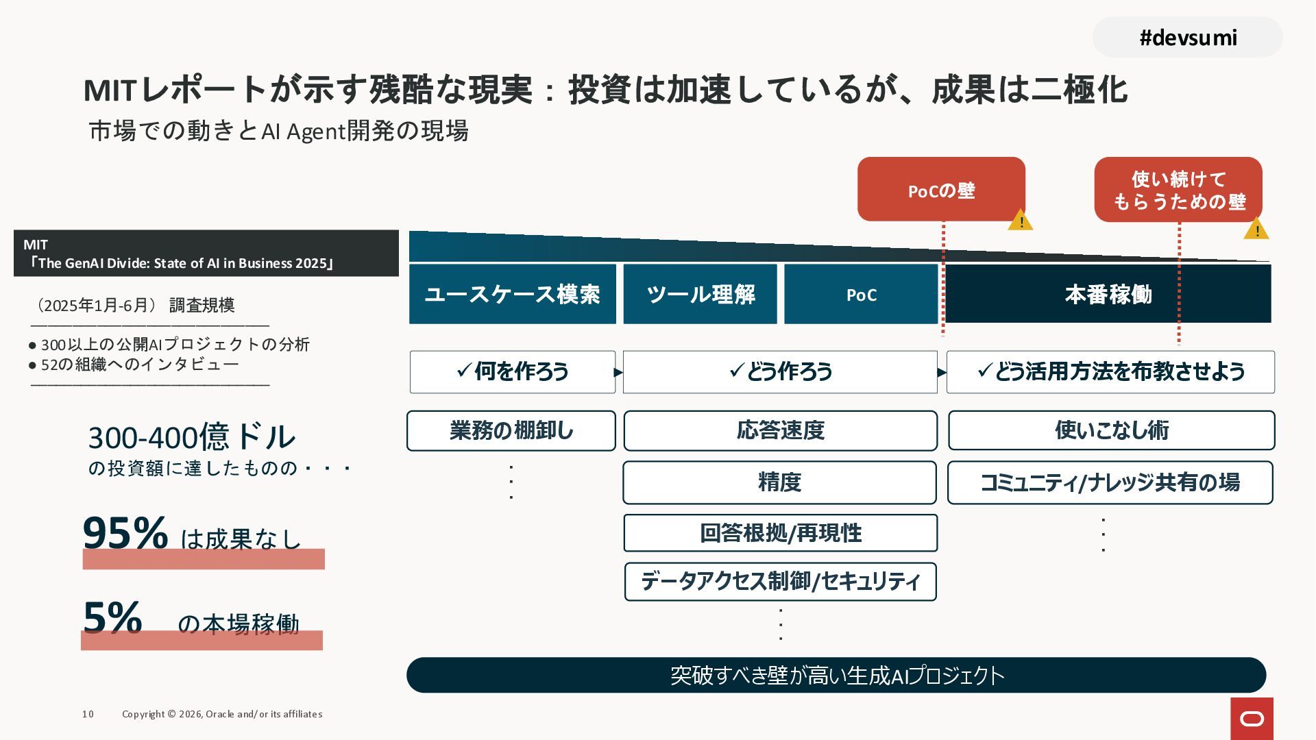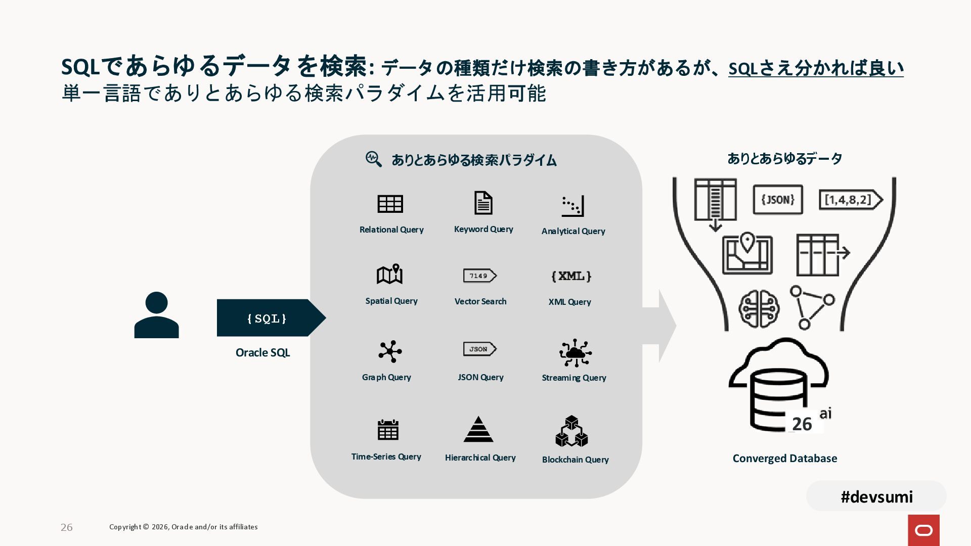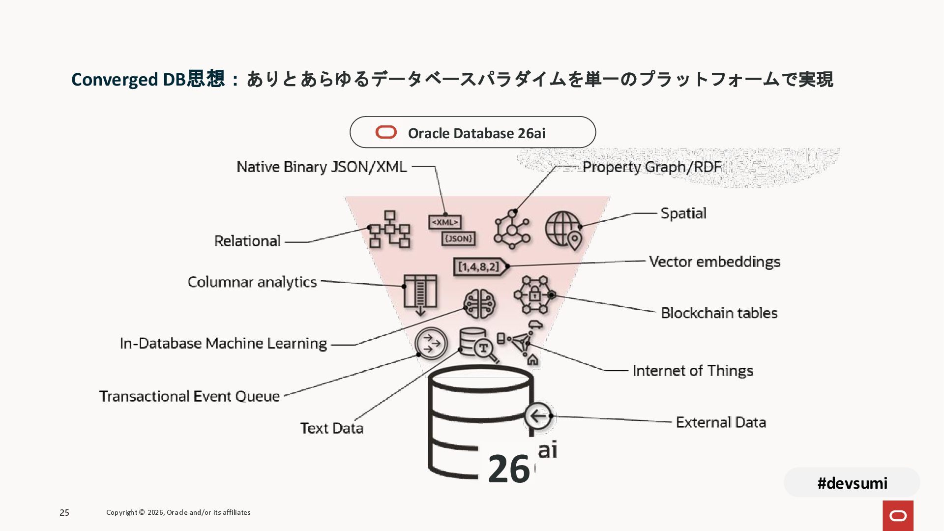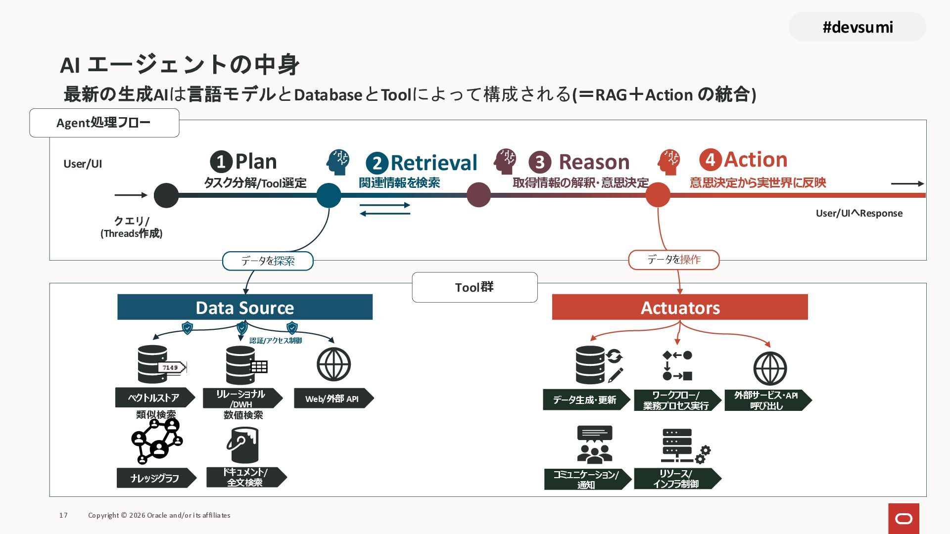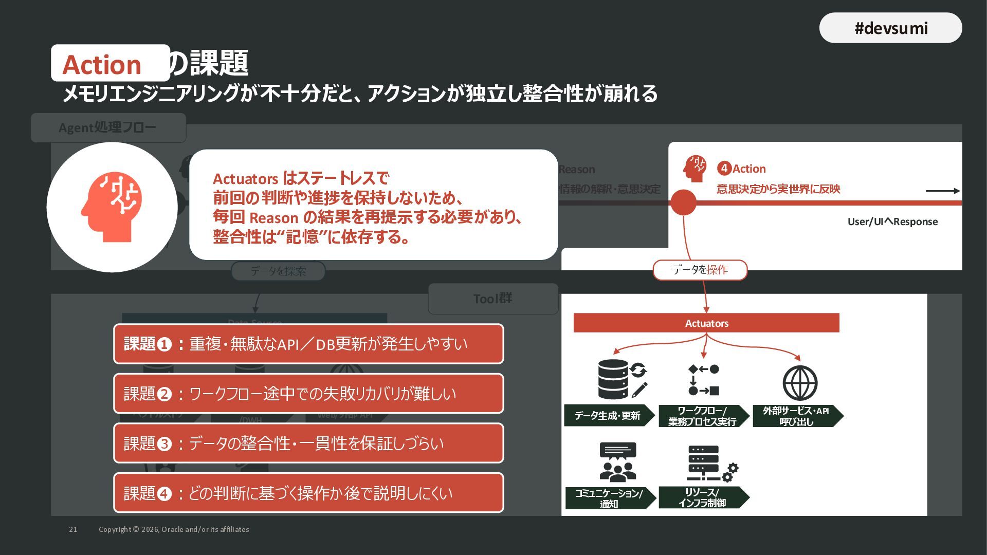 本セッションでは、最新のメモリ領域に関する研究論文を紹介しつつ、アプリケーションエンジニアが実際に直面する 「実装の複雑さ」 に踏み込みます。短期記憶、長期記憶、スキル管理、目的別に派生した各種 xxxRAG のために、用途ごとに異なるデータベースを乱立させる必要はありません。Oracle AI Database を 「Memory Core」 と位置づけ、単一のデータベース上であらゆるメモリ領域を統合・管理することで、エンタープライズ企業で運用可能なAI Agentを構築するアーキテクチャを具体的に解説します。