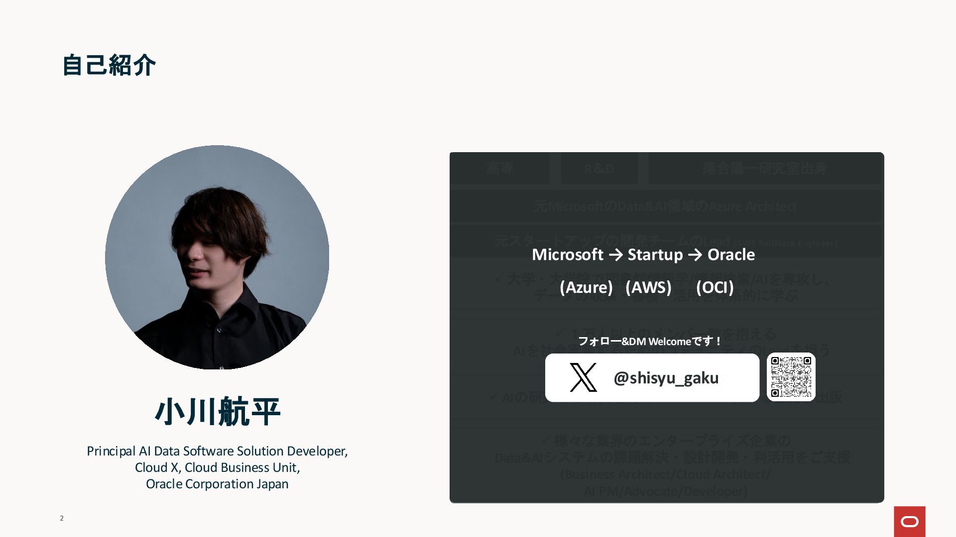 X, Cloud Business Unit, Oracle Corporation Japan ✓ 大学・大学院で図書館情報学/情報検索/AIを専攻し、 データの収集・蓄積・活用を体系的に学ぶ ✓ 1万人以上のメンバー数を抱える AIを社会実装するためのコミュニティのLeadを担う ✓ AIの研究者と研究者向けのChatGPTに関する書籍を出版 ✓ 様々な業界のエンタープライズ企業の Data&AIシステムの課題解決・設計開発・利活用をご支援 (Business Architect/Cloud Architect/ AI PM/Advocate/Developer) 高専 R&D 元MicrosoftのData&AI領域のAzure Architect 元スタートアップの開発チームのLead (AWS FullStack Engineer) 落合陽一研究室出身 @shisyu_gaku フォロー&DM Welcomeです! (Azure) (AWS) (OCI) Microsoft → Startup → Oracle