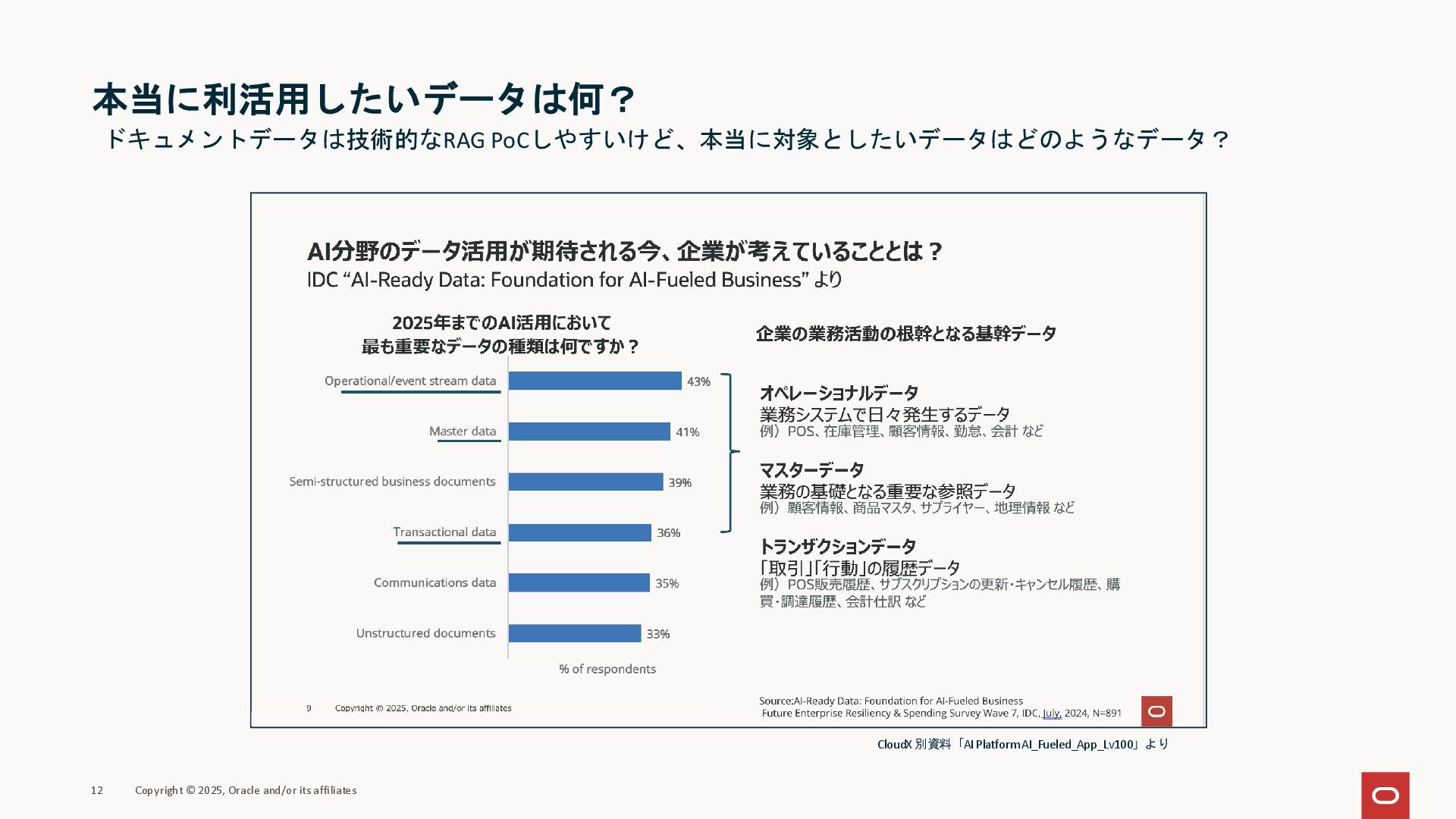 10. 本当に利活用したいデータは何? 12 Copyright © 2025, Oracle and/or its affiliates ドキュメントデータは技術的なRAG