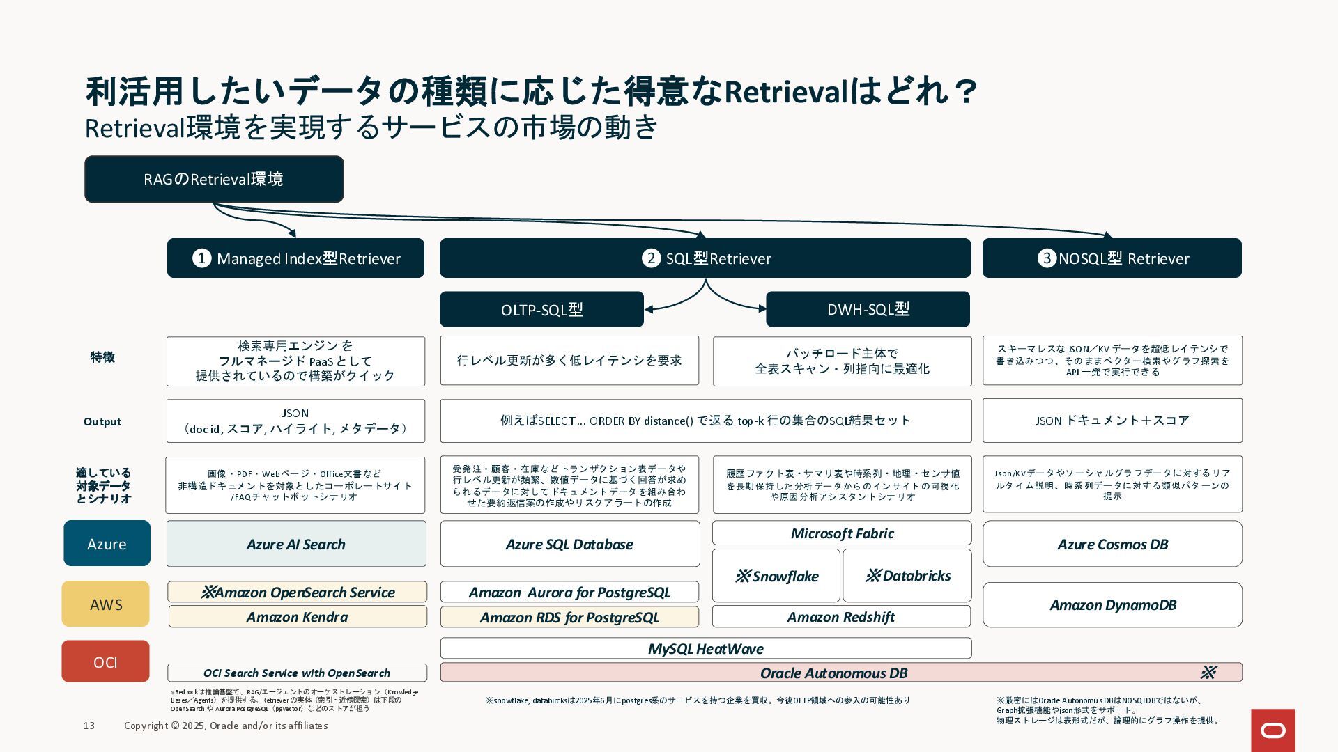❷ SQL型Retriever ❸NOSQL型 Retriever ❶ Managed Index型Retriever OLTP-SQL型 DWH-SQL型 RAGのRetrieval環境 Azure AWS OCI ※Amazon OpenSearch Service Oracle Autonomous DB ※ Azure AI Search Azure SQL Database Microsoft Fabric Amazon Redshift Azure Cosmos DB Amazon DynamoDB Amazon Kendra Amazon Aurora for PostgreSQL Amazon RDS for PostgreSQL MySQL HeatWave 検索専用エンジン を フルマネージド PaaS として 提供されているので構築がクイック 行レベル更新が多く低レイテンシを要求 スキーマレスな JSON/KV データを超低レイテンシで 書き込みつつ、そのままベクター検索やグラフ探索を API 一発で実行できる JSON (doc id, スコア, ハイライト, メタデータ) Output 例えばSELECT ... ORDER BY distance() で返る top-k 行の集合のSQL結果セット JSON ドキュメント+スコア ※厳密にはOracle Autonomus DBはNOSQLDBではないが、 Graph拡張機能やjson形式をサポート。 物理ストレージは表形式だが、論理的にグラフ操作を提供。 特徴 画像・PDF・Webページ・Office文書など 非構造ドキュメントを対象としたコーポレートサイト /FAQチャットボットシナリオ 履歴ファクト表・サマリ表や時系列・地理・センサ値 を長期保持した分析データからのインサイトの可視化 や原因分析アシスタントシナリオ 受発注・顧客・在庫などトランザクション表データや 行レベル更新が頻繁、数値データに基づく回答が求め られるデータに対してドキュメントデータを組み合わ せた要約返信案の作成やリスクアラートの作成 Json/KVデータやソーシャルグラフデータに対するリア ルタイム説明、時系列データに対する類似パターンの 提示 適している 対象データ とシナリオ ※ Snowflake ※ Databricks バッチロード主体で 全表スキャン・列指向に最適化 OCI Search Service with OpenSearch ※Bedrockは推論基盤で、RAG/エージェントのオーケストレーション(Knowledge Bases/Agents)を提供する。Retriever の実体(索引・近傍探索)は下段の OpenSearch や Aurora PostgreSQL(pgvector)などのストアが担う ※snowflake, databircksは2025年6月にpostgres系のサービスを持つ企業を買収。今後OLTP領域への参入の可能性あり