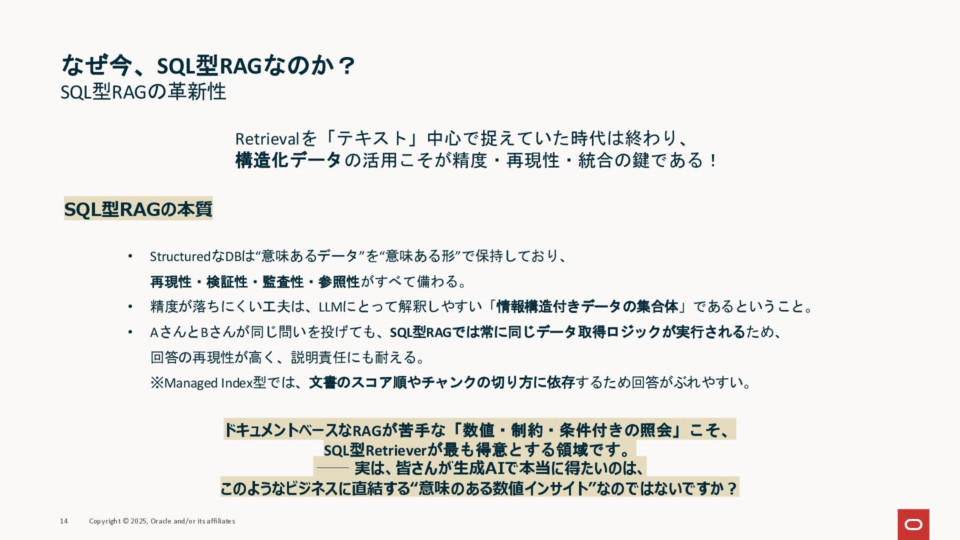 SQL型RAGの本質 Retrievalを「テキスト」中心で捉えていた時代は終わり、 構造化データの活用こそが精度・再現性・統合の鍵である! • StructuredなDBは“意味あるデータ”を“意味ある形”で保持しており、 再現性・検証性・監査性・参照性がすべて備わる。 • 精度が落ちにくい工夫は、LLMにとって解釈しやすい「情報構造付きデータの集合体」であるということ。 • AさんとBさんが同じ問いを投げても、SQL型RAGでは常に同じデータ取得ロジックが実行されるため、 回答の再現性が高く、説明責任にも耐える。 ※Managed Index型では、文書のスコア順やチャンクの切り方に依存するため回答がぶれやすい。 ドキュメントベースなRAGが苦手な「数値・制約・条件付きの照会」こそ、 SQL型Retrieverが最も得意とする領域です。 ── 実は、皆さんが生成AIで本当に得たいのは、 このようなビジネスに直結する“意味のある数値インサイト”なのではないですか?