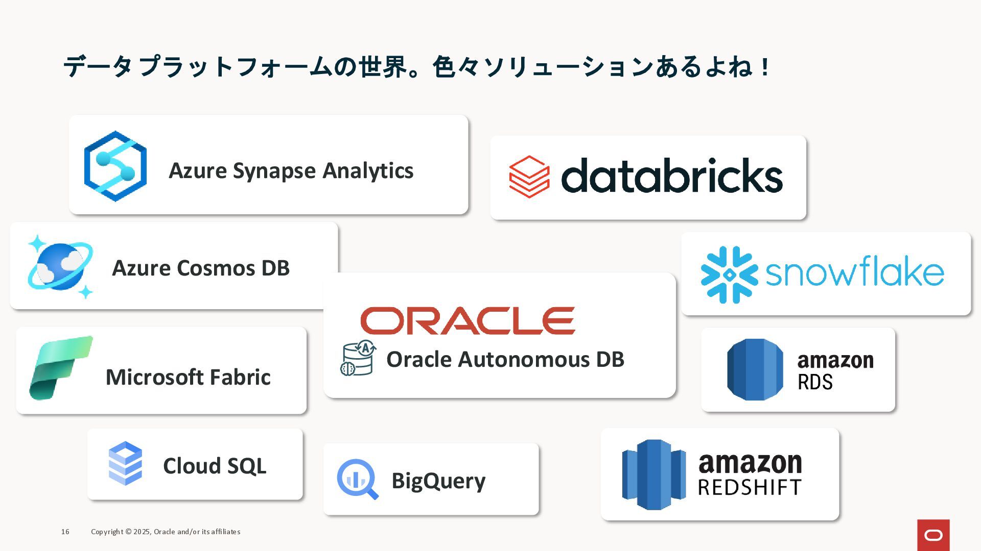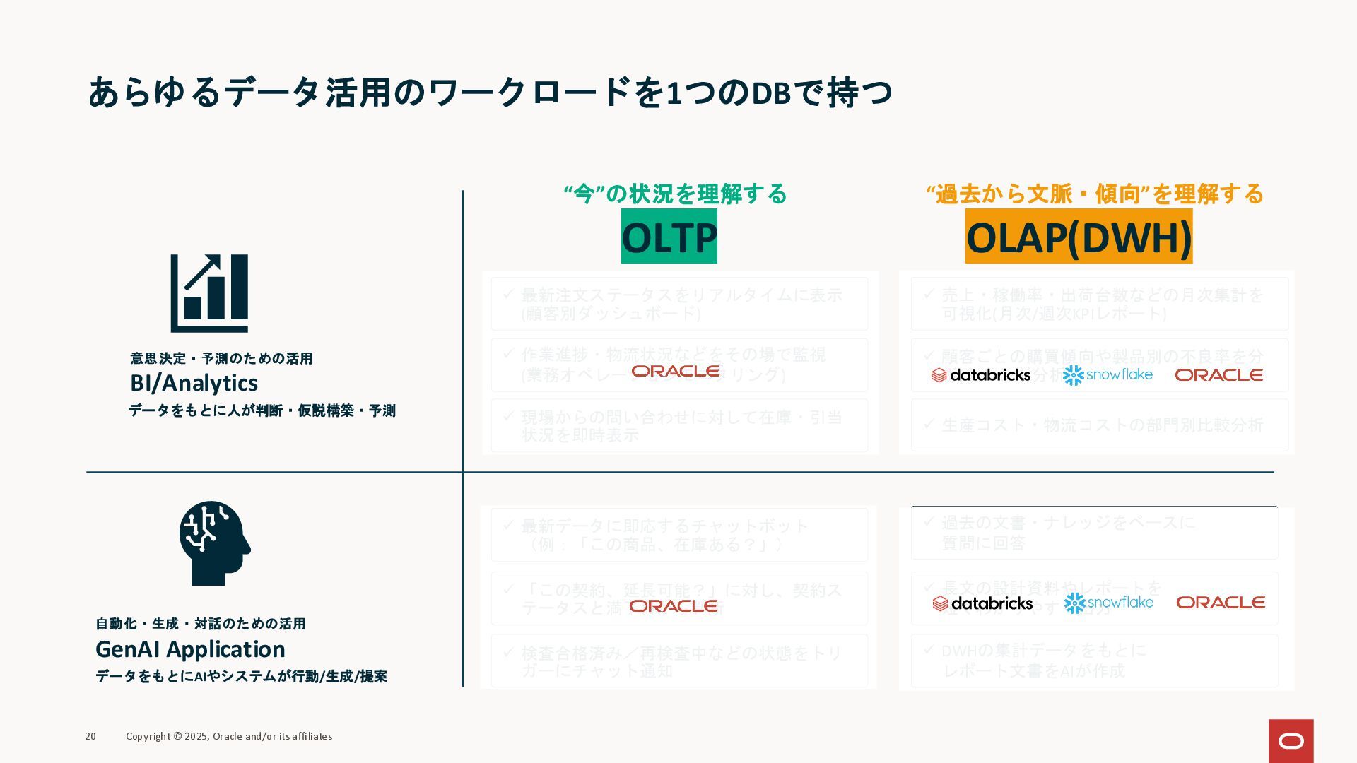 16. あらゆるデータ活用のワークロードを1つのDBで持つ 20 Copyright © 2025, Oracle and/or its affiliates BI/Analytics