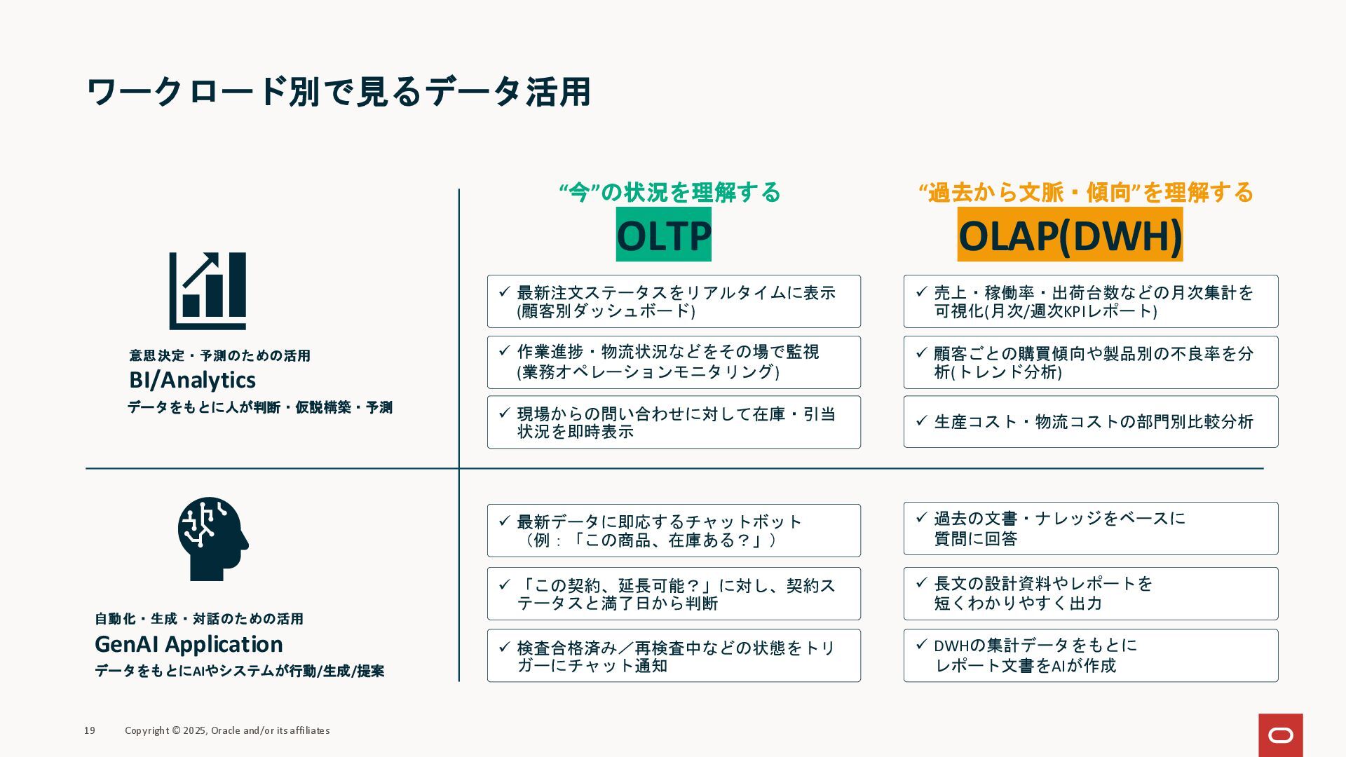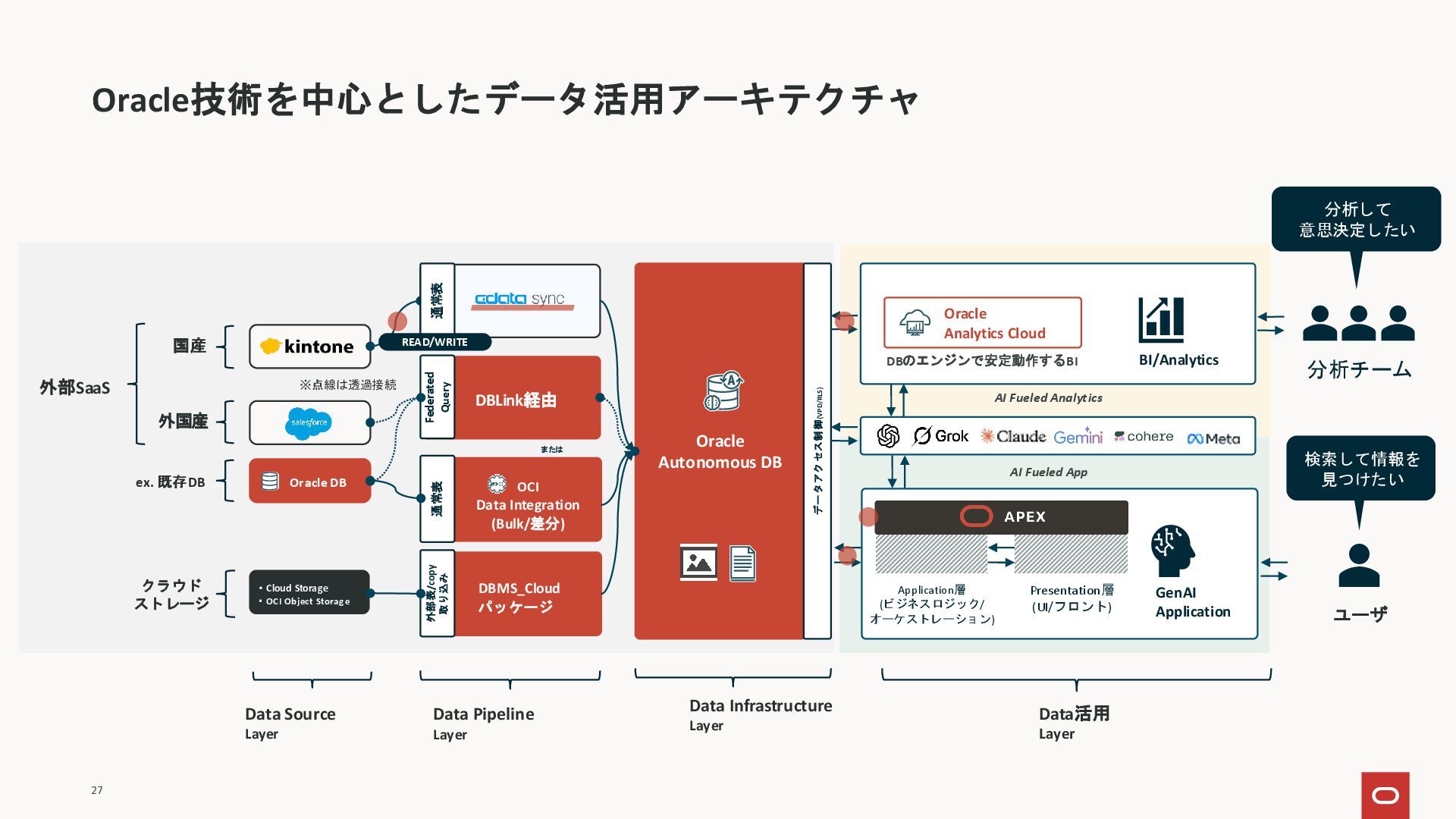 Layer 外国産 Federated Query DBLink経由 ex. 既存DB Oracle DB または 通常表 OCI Data Integration (Bulk/差分) ・Cloud Storage ・OCI Object Storage 外部表/copy 取り込み DBMS_Cloud パッケージ クラウド ストレージ ※点線は透過接続 Oracle Autonomous DB データアクセス制御(VPD/RLS) Data活用 Layer Presentation層 (UI/フロント) Application層 (ビジネスロジック/ オーケストレーション) ユーザ 通常表 国産 外部SaaS BI/Analytics GenAI Application Oracle Analytics Cloud 分析チーム 分析して 意思決定したい 検索して情報を 見つけたい AI Fueled Analytics AI Fueled App DBのエンジンで安定動作するBI READ/WRITE
