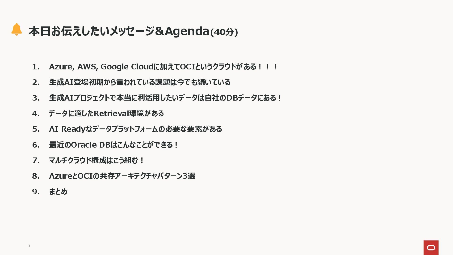 4. データに適したRetrieval環境がある 5. AI Readyなデータプラットフォームの必要な要素がある 6. 最近のOracle DBはこんなことができる! 7. マルチクラウド構成はこう組む! 8. AzureとOCIの共存アーキテクチャパターン3選 9. まとめ 本日お伝えしたいメッセージ&Agenda(40分)