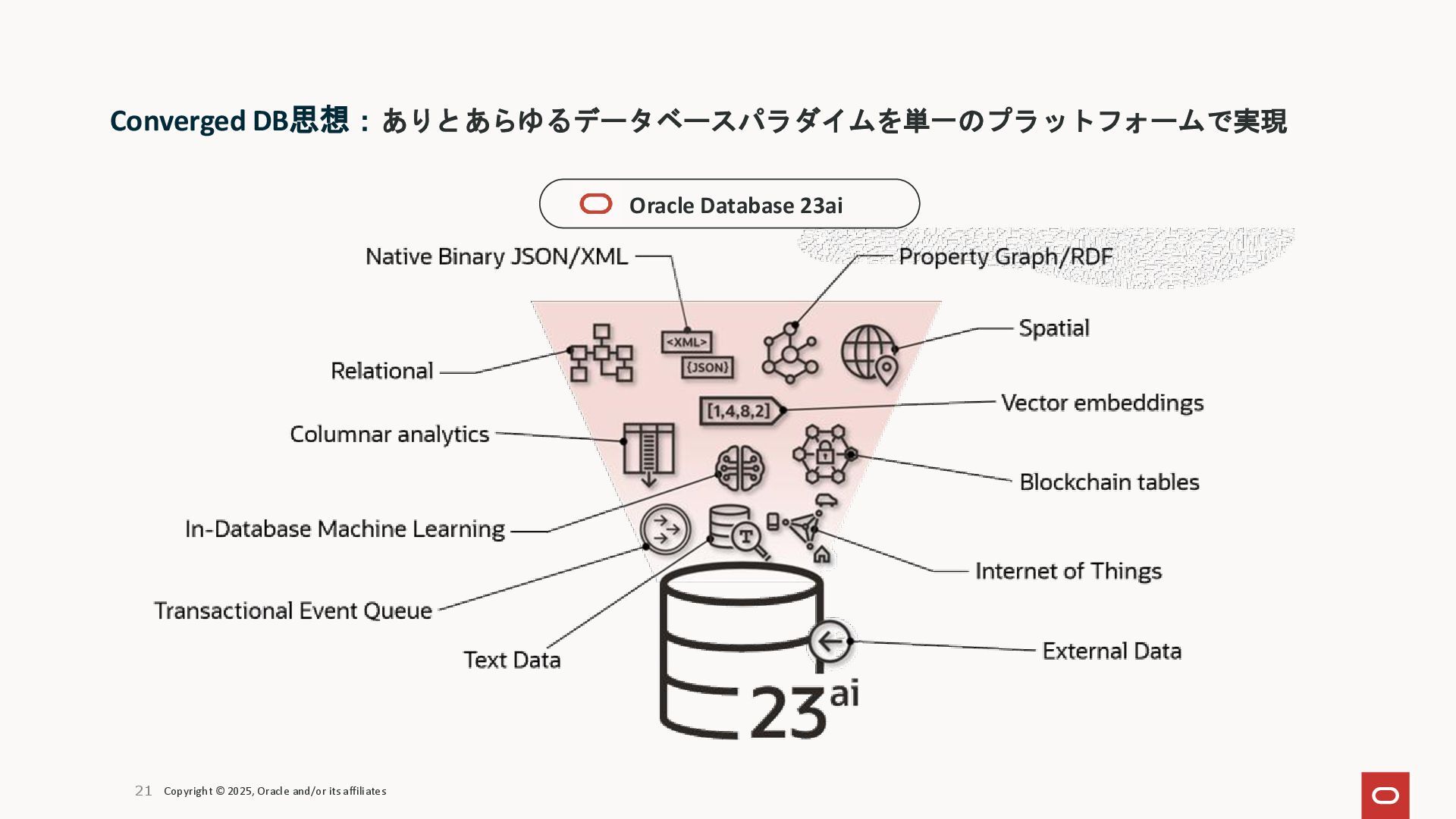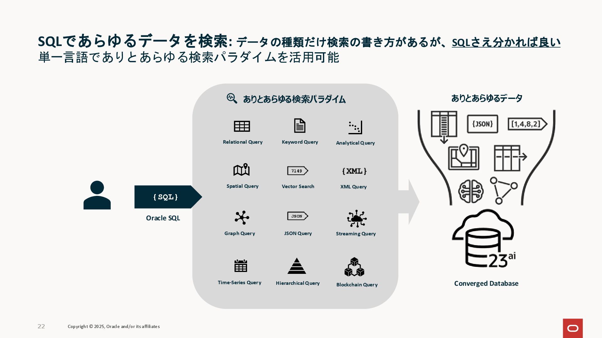 Spatial Query Vector Search Graph Query JSON Query Time-Series Query Hierarchical Query Analytical Query XML Query Streaming Query Blockchain Query Converged Database ありとあらゆる検索パラダイム {SQL} ありとあらゆるデータ Copyright © 2025, Oracle and/or its affiliates