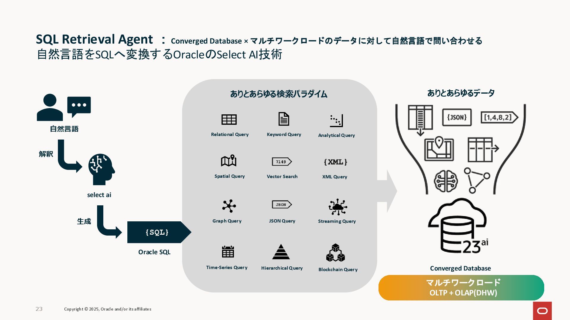 18. SQL Retrieval Agent :Converged Database × マルチワークロードのデータに対して自然言語で問い合わせる 自然言語をSQLへ変換するOracleのSelect AI技術 23