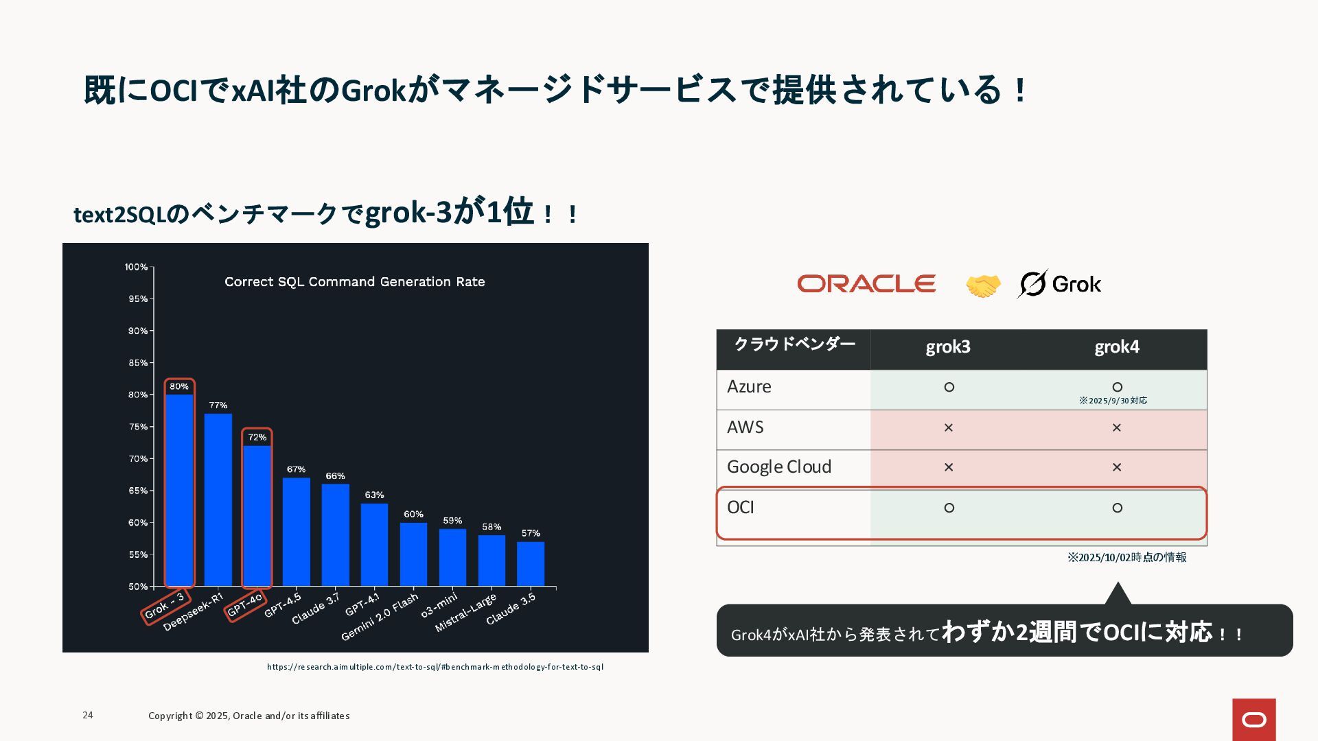 × Google Cloud × × OCI ◦ ◦ ※2025/10/02時点の情報 https://research.aimultiple.com/text-to-sql/#benchmark-methodology-for-text-to-sql Grok4がxAI社から発表されてわずか2週間でOCIに対応!! text2SQLのベンチマークでgrok-3が1位!! Copyright © 2025, Oracle and/or its affiliates ※2025/9/30対応