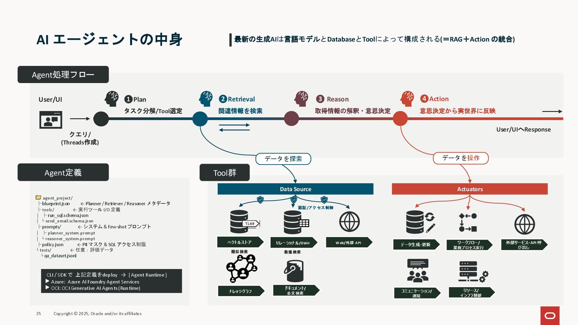 ベクトルストア リレーショナル/DWH ナレッジグラフ ドキュメント/ 全文検索 Web/外部 API データ生成・更新 ワークフロー/ 業務プロセス実行 コミュニケーション/ 通知 リソース/ インフラ制御 外部サービス・API 呼 び出し ❷Retrieval ❹Action 最新の生成AIは言語モデルとDatabaseとToolによって構成される(=RAG+Action の統合) User/UI Actuators Data Source ❶Plan ❸ Reason クエリ/ (Threads作成) User/UIへResponse Tool群 Agent処理フロー タスク分解/Tool選定 取得情報の解釈・意思決定 類似検索 数値検索 データを探索 データを操作 意思決定から実世界に反映 認証/アクセス制御 関連情報を検索 Agent定義 agent_project/ ├ blueprint.json ← Planner / Retriever / Reasoner メタデータ ├ tools/ ← 実行ツール I/O 定義 │ ├ run_sql.schema.json │ └ send_email.schema.json ├ prompts/ ← システム & Few-shot プロンプト │ ├ planner_system.prompt │ └ reasoner_system.prompt ├ policy.json ← PII マスク & SQL アクセス制限 └ tests/ ← 任意:評価データ └ qa_dataset.jsonl CLI / SDK で 上記定義をdeploy → [ Agent Runtime ] Azure: Azure AI Foundry Agent Services OCI: OCI Generative AI Agents (Runtime)