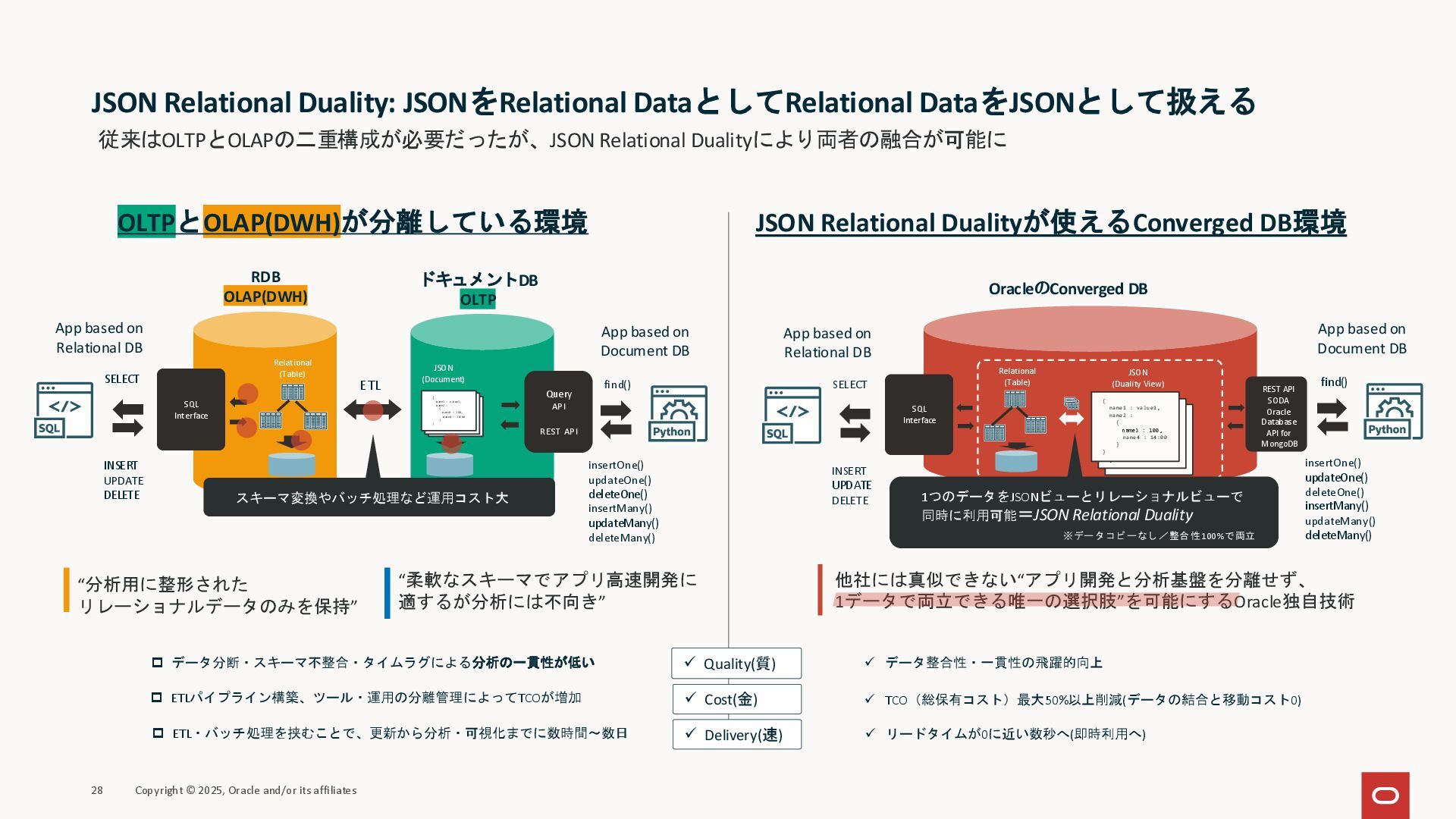 Oracle and/or its affiliates Query API REST API SQL Interface Relational (Table) JSON (Document) App based on Document DB App based on Relational DB find() SELECT INSERT UPDATE DELETE insertOne() updateOne() deleteOne() insertMany() updateMany() deleteMany() ETL { na me 1 : va lu e1 , na me 2 : { na me 3 : 10 0, na me 4 : 14 :0 0 } } { na me 1 : va lu e1 , na me 2 : { na me 3 : 10 0, na me 4 : 14 :0 0 } } { na me 1 : va lu e1, na me 2 : { na me 3 : 10 0, na me 4 : 14 :0 0 } } 従来はOLTPとOLAPの二重構成が必要だったが、JSON Relational Dualityにより両者の融合が可能に OLTPとOLAP(DWH)が分離している環境 ドキュメントDB OLTP RDB OLAP(DWH) { name1 : value1, name2 : { name3 : 100, name4 : 14:00 } } { name1 : value1, name2 : { name3 : 100, name4 : 14:00 } } { name1 : value1, name2 : { name3 : 100, name4 : 14:00 } } Relational (Table) JSON (Duality View) OracleのConverged DB JSON Relational Dualityが使えるConverged DB環境 REST API SODA Oracle Database API for MongoDB SQL Interface App based on Relational DB SELECT INSERT UPDATE DELETE App based on Document DB find() insertOne() updateOne() deleteOne() insertMany() updateMany() deleteMany() 他社には真似できない“アプリ開発と分析基盤を分離せず、 1データで両立できる唯一の選択肢”を可能にするOracle独自技術 スキーマ変換やバッチ処理など運用コスト大 1つのデータをJSONビューとリレーショナルビューで 同時に利用可能=JSON Relational Duality “分析用に整形された リレーショナルデータのみを保持” “柔軟なスキーマでアプリ高速開発に 適するが分析には不向き” ✓ Quality(質) ✓ Cost(金) ✓ Delivery(速) ✓ データ整合性・一貫性の飛躍的向上 ✓ TCO(総保有コスト)最大50%以上削減(データの結合と移動コスト0) ✓ リードタイムが0に近い数秒へ(即時利用へ)  データ分断・スキーマ不整合・タイムラグによる分析の一貫性が低い  ETLパイプライン構築、ツール・運用の分離管理によってTCOが増加  ETL・バッチ処理を挟むことで、更新から分析・可視化までに数時間〜数日 ※データコピーなし/整合性100%で両立