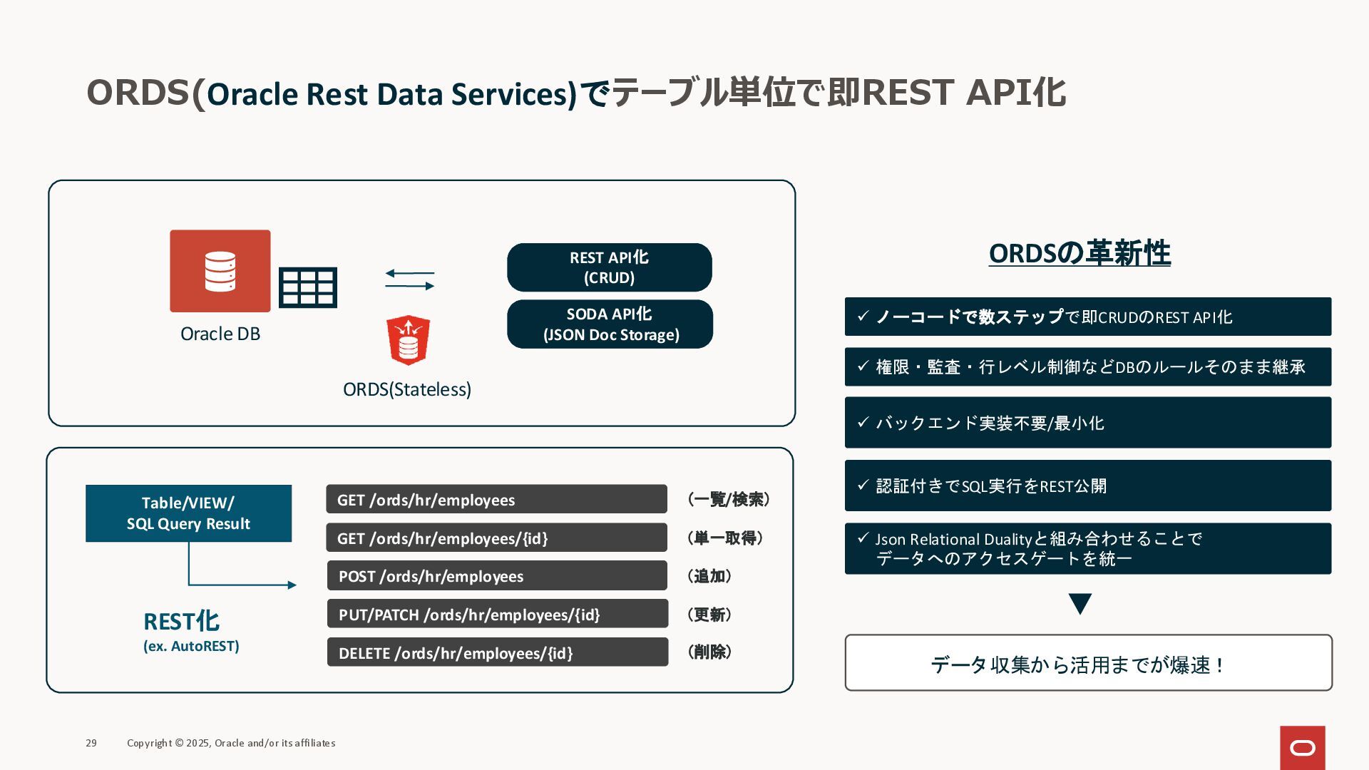 Data Services)でテーブル単位で即REST API化 Oracle DB ORDS(Stateless) SODA API化 (JSON Doc Storage) REST API化 (CRUD) Table/VIEW/ SQL Query Result (一覧/検索) GET /ords/hr/employees GET /ords/hr/employees/{id} POST /ords/hr/employees PUT/PATCH /ords/hr/employees/{id} DELETE /ords/hr/employees/{id} (単一取得) (追加) (更新) (削除) REST化 (ex. AutoREST) ✓ ノーコードで数ステップで即CRUDのREST API化 ORDSの革新性 ✓ 権限・監査・行レベル制御などDBのルールそのまま継承 ✓ バックエンド実装不要/最小化 ✓ 認証付きでSQL実行をREST公開 ✓ Json Relational Dualityと組み合わせることで データへのアクセスゲートを統一 データ収集から活用までが爆速!