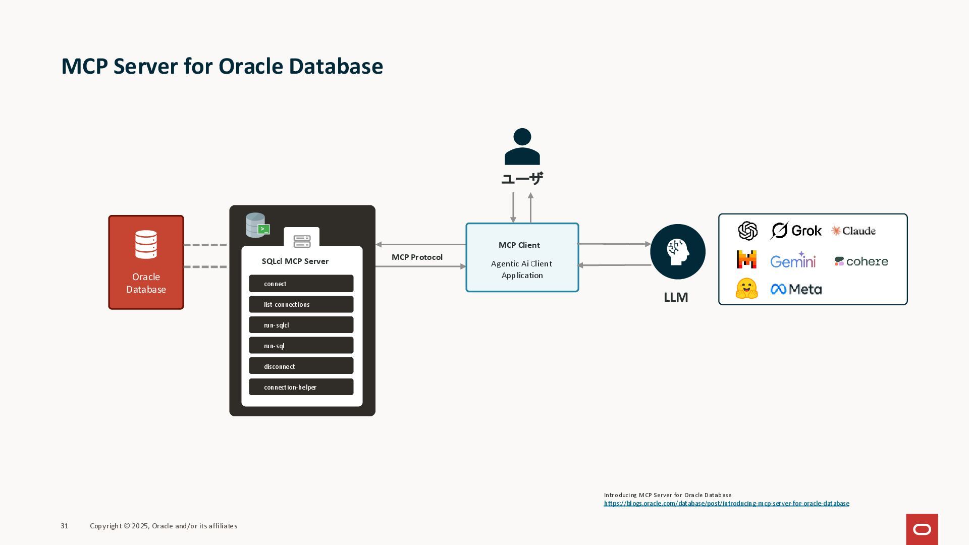and/or its affiliates Introducing MCP Server for Oracle Database https://blogs.oracle.com/database/post/introducing-mcp-server-for-oracle-database Oracle Database SQLcl MCP Server connect list-connections run-sqlcl run-sql disconnect connection-helper MCP Protocol MCP Client Agentic Ai Client Application LLM ユーザ