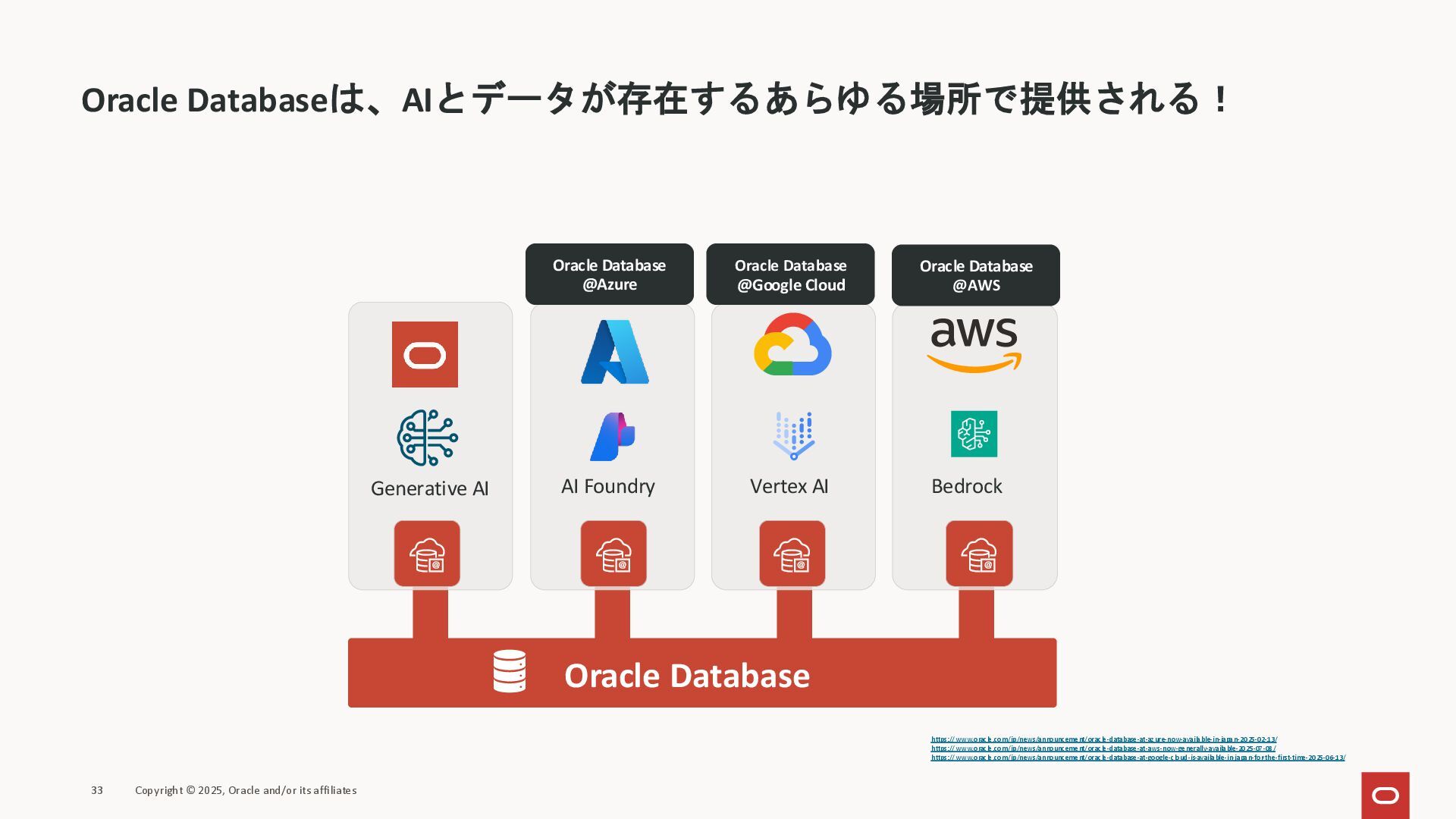 AI Foundry Bedrock Vertex AI Generative AI Oracle Database Oracle Database @Azure Oracle Database @Google Cloud Oracle Database @AWS https://www.oracle.com/jp/news/announcement/oracle-database-at-azure-now-available-in-japan-2025-02-13/ https://www.oracle.com/jp/news/announcement/oracle-database-at-aws-now-generally-available-2025-07-08/ https://www.oracle.com/jp/news/announcement/oracle-database-at-google-cloud-is-available-in-japan-for-the-first-time-2025-06-13/