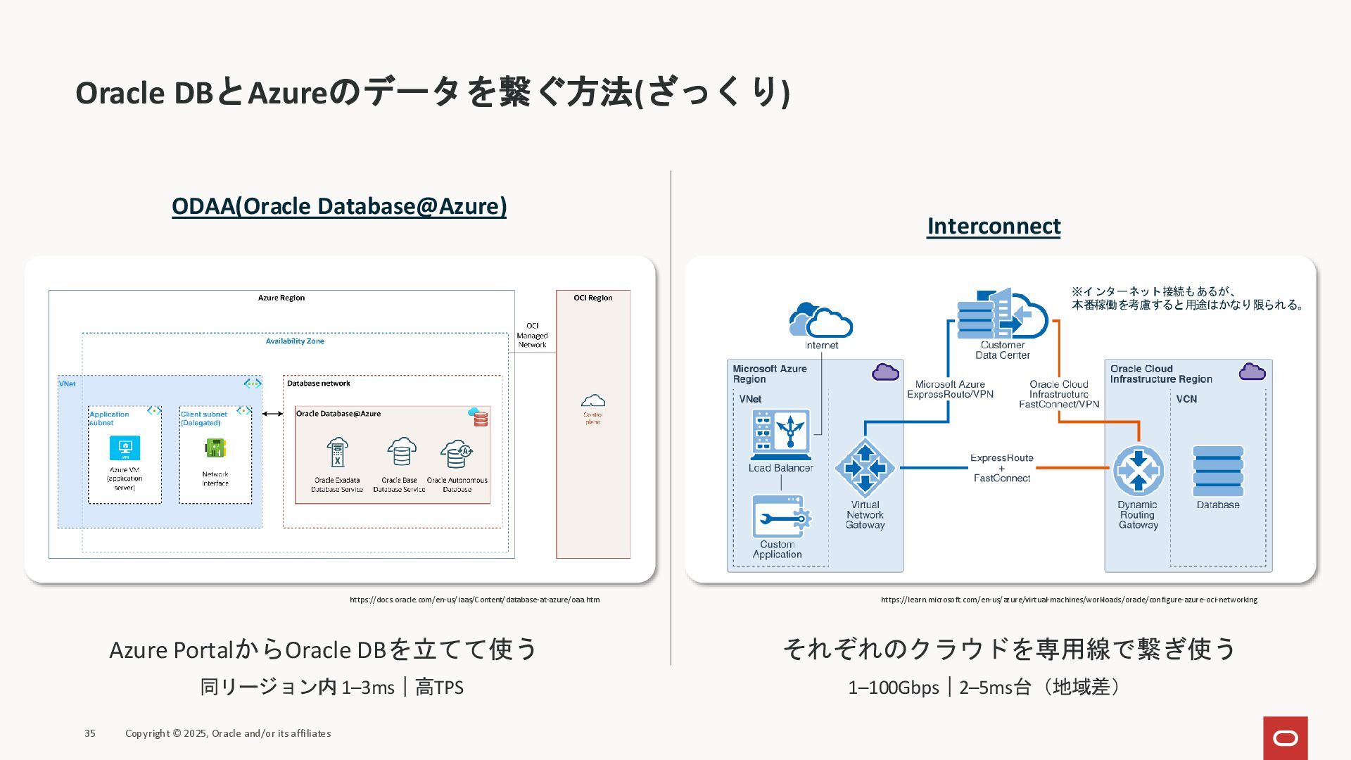 Interconnect ODAA(Oracle Database@Azure) https://docs.oracle.com/en-us/iaas/Content/database-at-azure/oaa.htm https://learn.microsoft.com/en-us/azure/virtual-machines/workloads/oracle/configure-azure-oci-networking Azure PortalからOracle DBを立てて使う ※インターネット接続もあるが、 本番稼働を考慮すると用途はかなり限られる。 それぞれのクラウドを専用線で繋ぎ使う 同リージョン内 1–3ms|高TPS 1–100Gbps|2–5ms台(地域差)