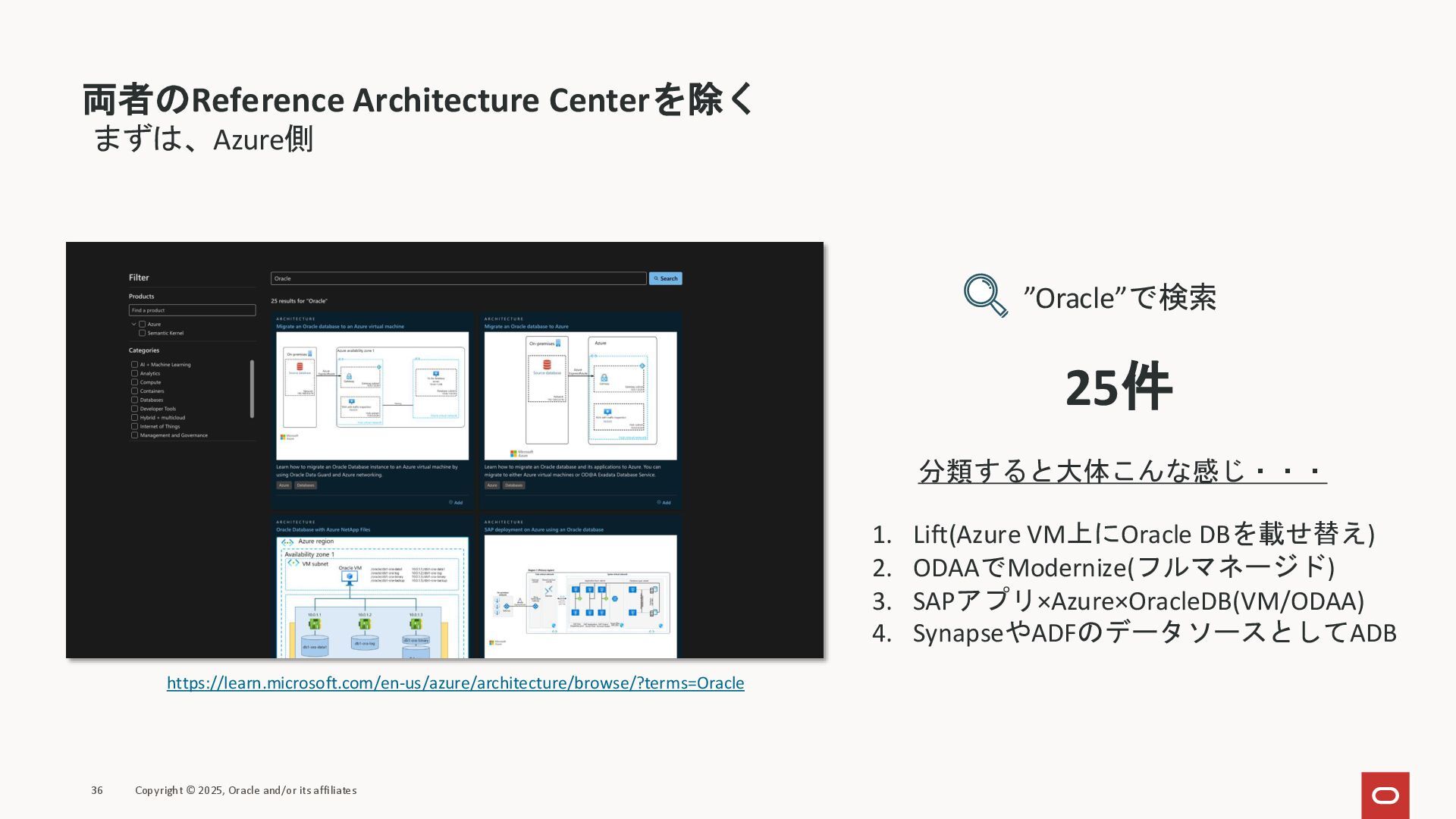 affiliates まずは、Azure側 ”Oracle”で検索 25件 1. Lift(Azure VM上にOracle DBを載せ替え) 2. ODAAでModernize(フルマネージド) 3. SAPアプリ×Azure×OracleDB(VM/ODAA) 4. SynapseやADFのデータソースとしてADB 分類すると大体こんな感じ・・・ https://learn.microsoft.com/en-us/azure/architecture/browse/?terms=Oracle