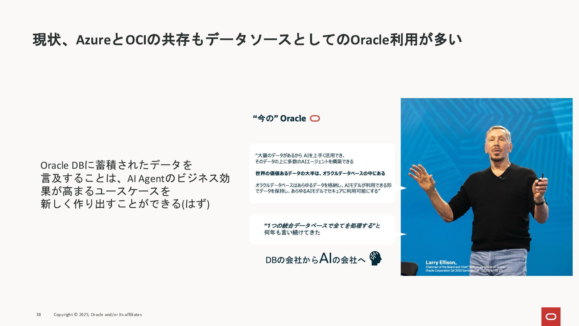 31. 現状、AzureとOCIの共存もデータソースとしてのOracle利用が多い 38 Copyright © 2025, Oracle and/or its affiliates Oracle