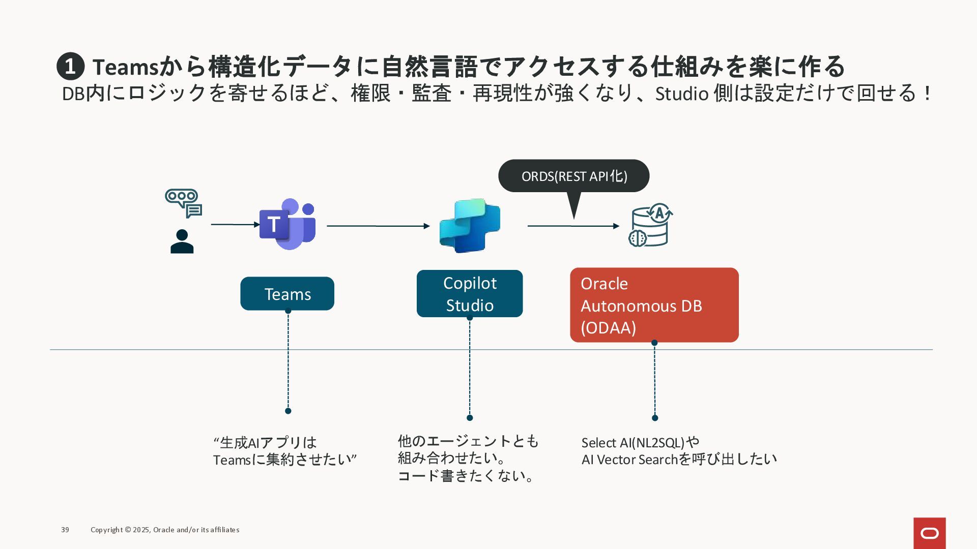 DB内にロジックを寄せるほど、権限・監査・再現性が強くなり、Studio 側は設定だけで回せる! Teams Copilot Studio Oracle Autonomous DB (ODAA) Select AI(NL2SQL)や AI Vector Searchを呼び出したい “生成AIアプリは Teamsに集約させたい” 他のエージェントとも 組み合わせたい。 コード書きたくない。 ORDS(REST API化)