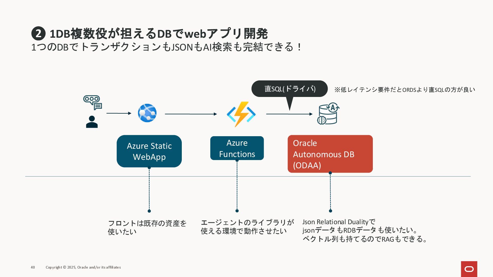 1つのDBでトランザクションもJSONもAI検索も完結できる! Azure Static WebApp Azure Functions Oracle Autonomous DB (ODAA) Json Relational Dualityで jsonデータもRDBデータも使いたい。 ベクトル列も持てるのでRAGもできる。 フロントは既存の資産を 使いたい エージェントのライブラリが 使える環境で動作させたい 直SQL(ドライバ) ※低レイテンシ要件だとORDSより直SQLの方が良い