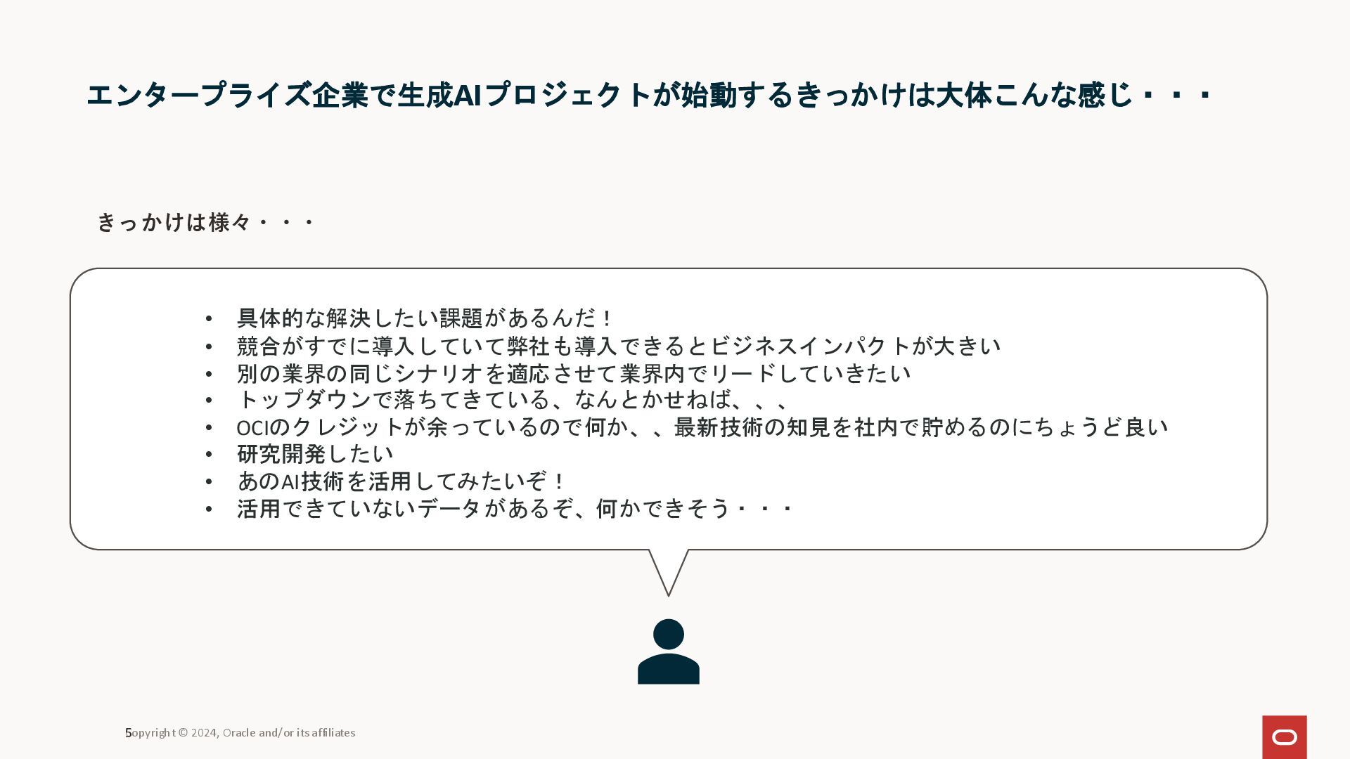 4. エンタープライズ企業で生成AIプロジェクトが始動するきっかけは大体こんな感じ・・・ Copyright © 2024, Oracle and/or its affiliates 5 •