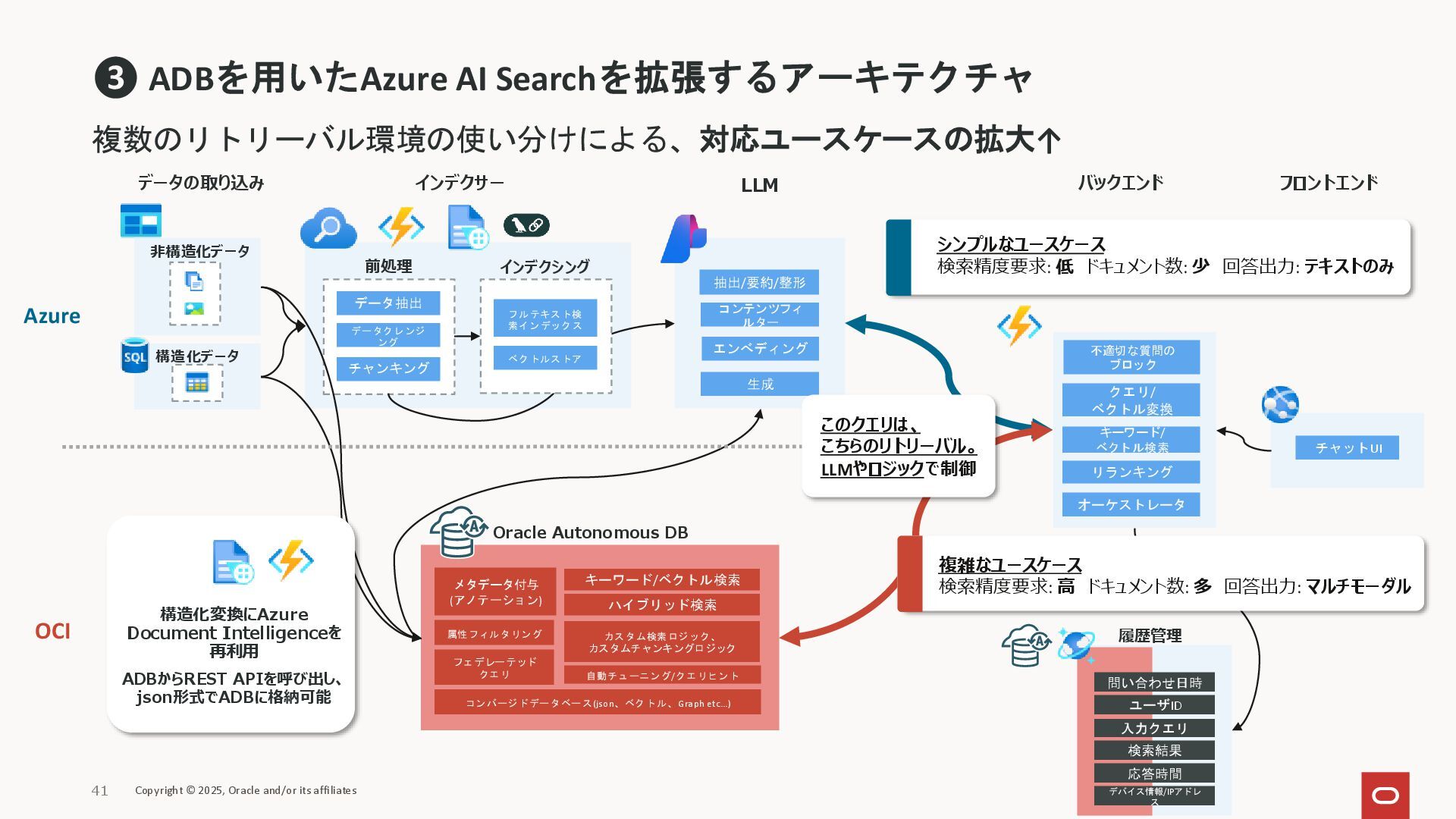 34. 複数のリトリーバル環境の使い分けによる、対応ユースケースの拡大↑ ❸ ADBを用いたAzure AI Searchを拡張するアーキテクチャ 41 Copyright © 2025, Oracle