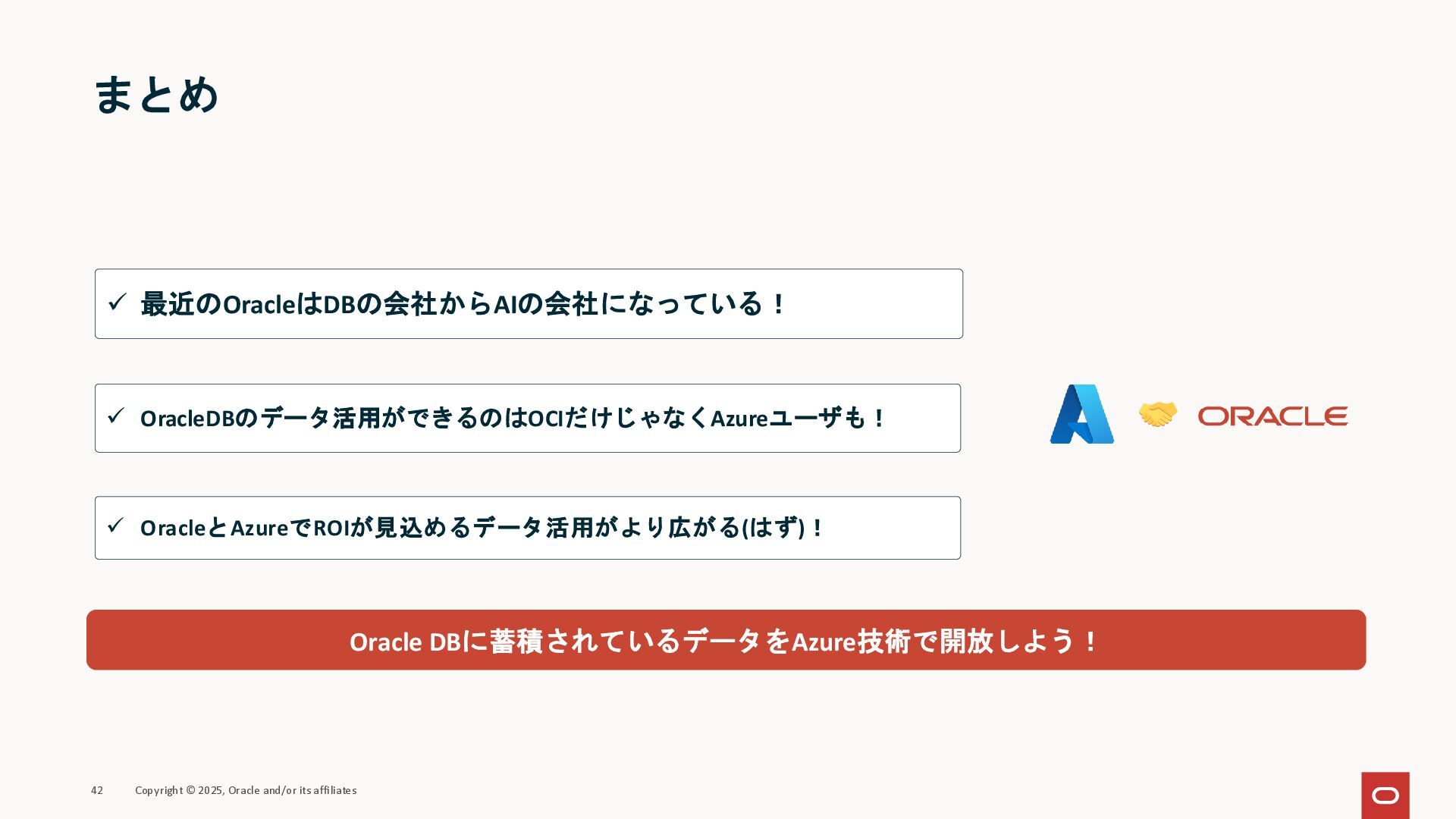 最近のOracleはDBの会社からAIの会社になっている! ✓ OracleDBのデータ活用ができるのはOCIだけじゃなくAzureユーザも! ✓ OracleとAzureでROIが見込めるデータ活用がより広がる(はず)! Oracle DBに蓄積されているデータをAzure技術で開放しよう!