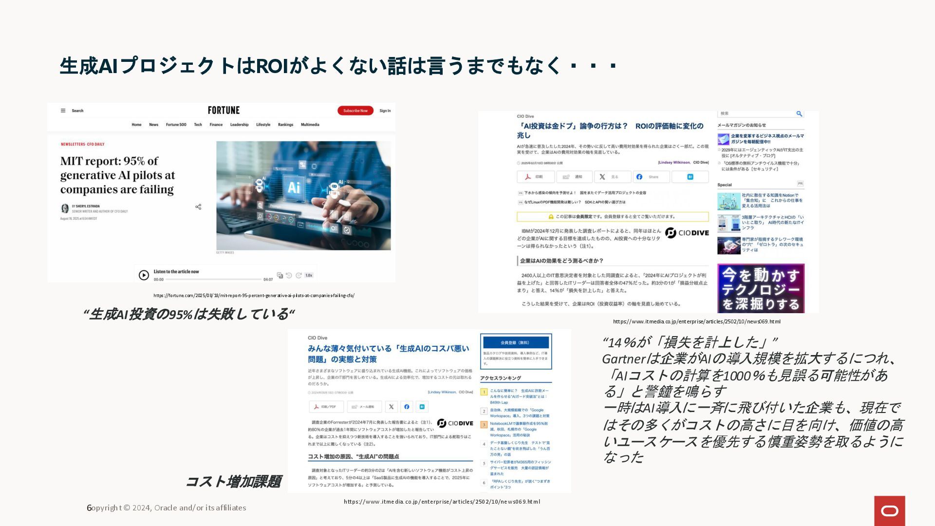 5. 生成AIプロジェクトはROIがよくない話は言うまでもなく・・・ Copyright © 2024, Oracle and/or its affiliates 6 “生成AI投資の95%は失敗している“