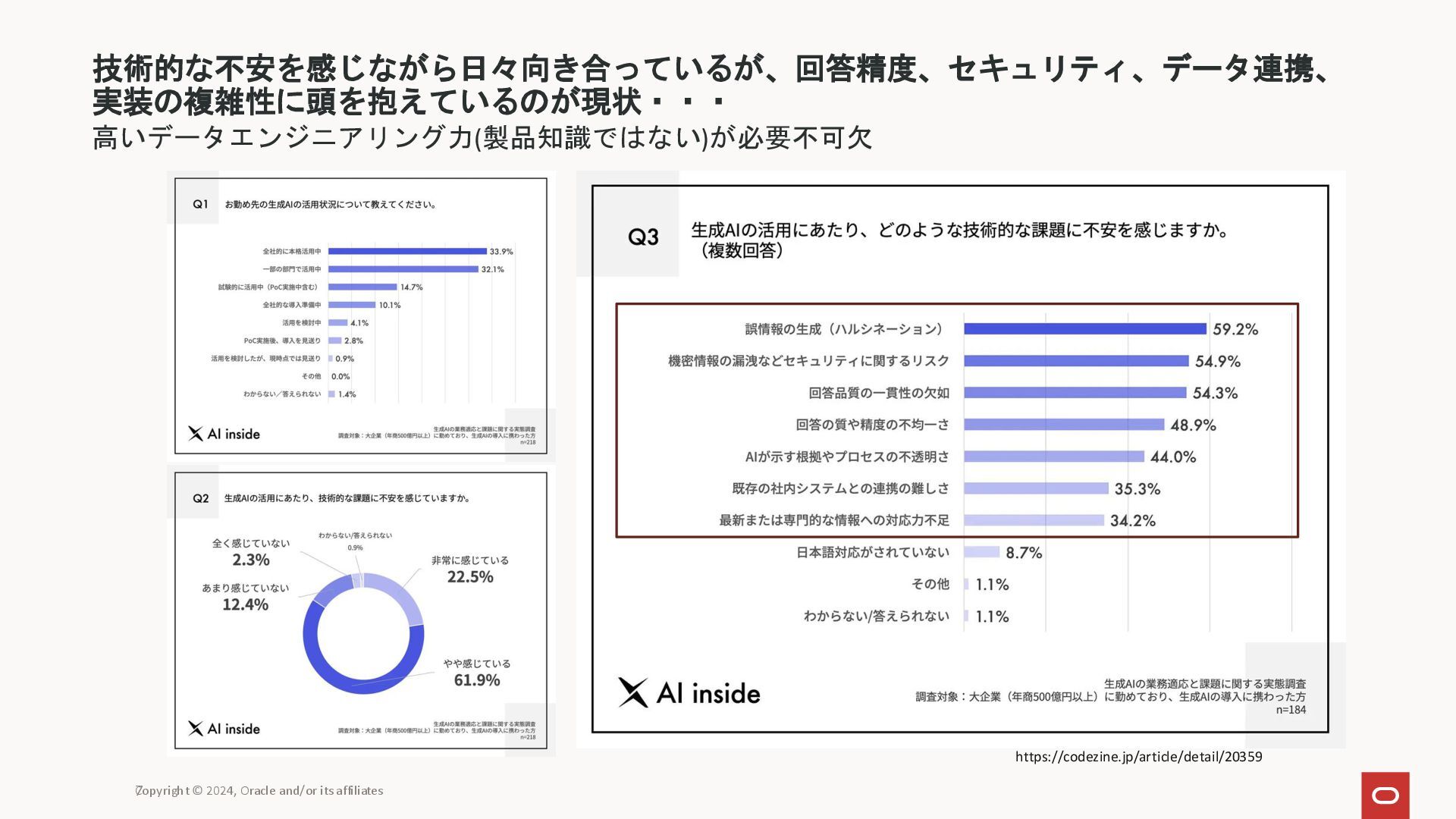 3. 3 1. Azure, AWS, Google Cloudに加えてOCIというクラウドがある!!! 2. 生成AI登場初期から言われている課題は今でも続いている 3. 生成AIプロジェクトで本当に利活用したいデータは自社のDBデータにある!