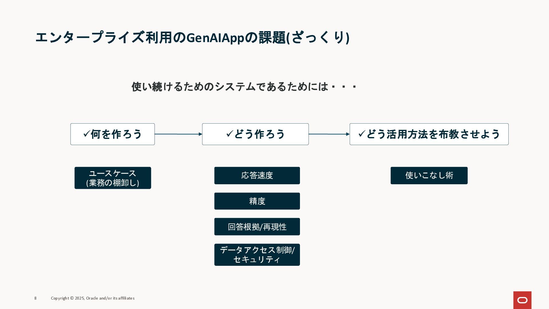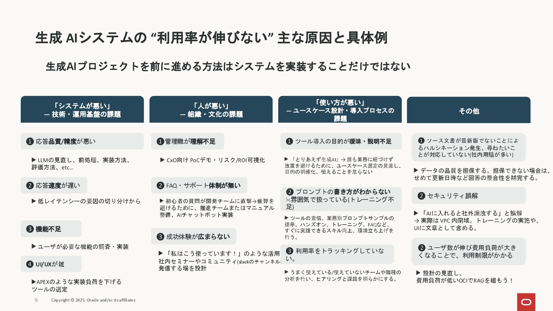 7. 生成 AIシステムの “利用率が伸びない” 主な原因と具体例 Copyright © 2025, Oracle and/or its