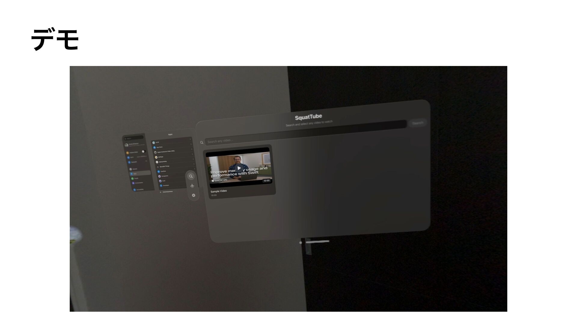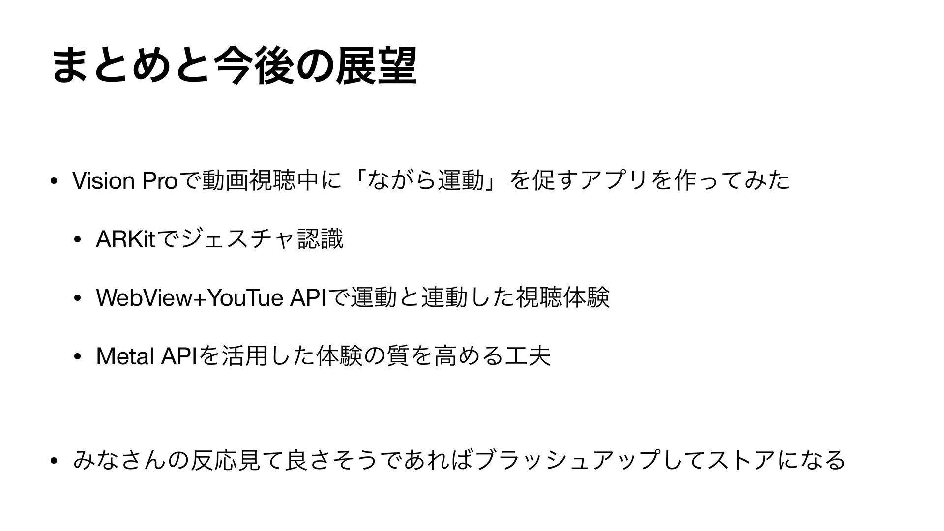 ·ͱΊͱࠓޙͷల • Vision ProͰಈըࢹௌதʹʮͳ͕ΒӡಈʯΛଅ͢ΞϓϦΛ࡞ͬͯΈͨ • ARKitͰδΣενϟೝࣝ • WebView+YouTue APIͰӡಈͱ࿈ಈͨ͠ࢹௌମݧ •