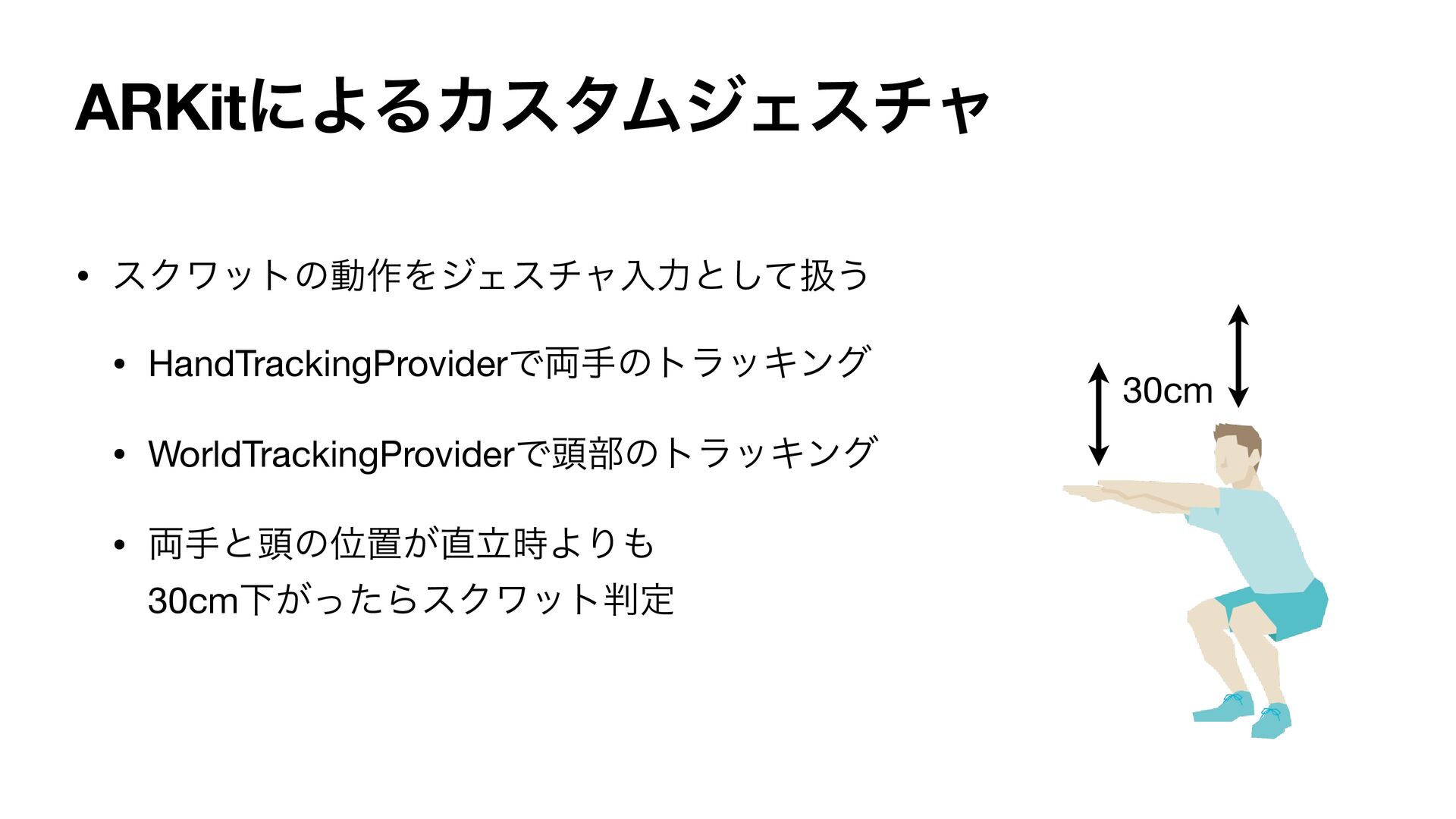 ARKitʹΑΔΧελϜδΣενϟ • εΫϫοτͷಈ࡞ΛδΣενϟೖྗͱͯ͠ѻ͏ • HandTrackingProviderͰ྆खͷτϥοΩϯά • WorldTrackingProviderͰ಄෦ͷτϥοΩϯά • ྆खͱ಄ͷҐஔཱ͕࣌ΑΓ 30cmԼ͕ͬͨΒεΫϫοτఆ