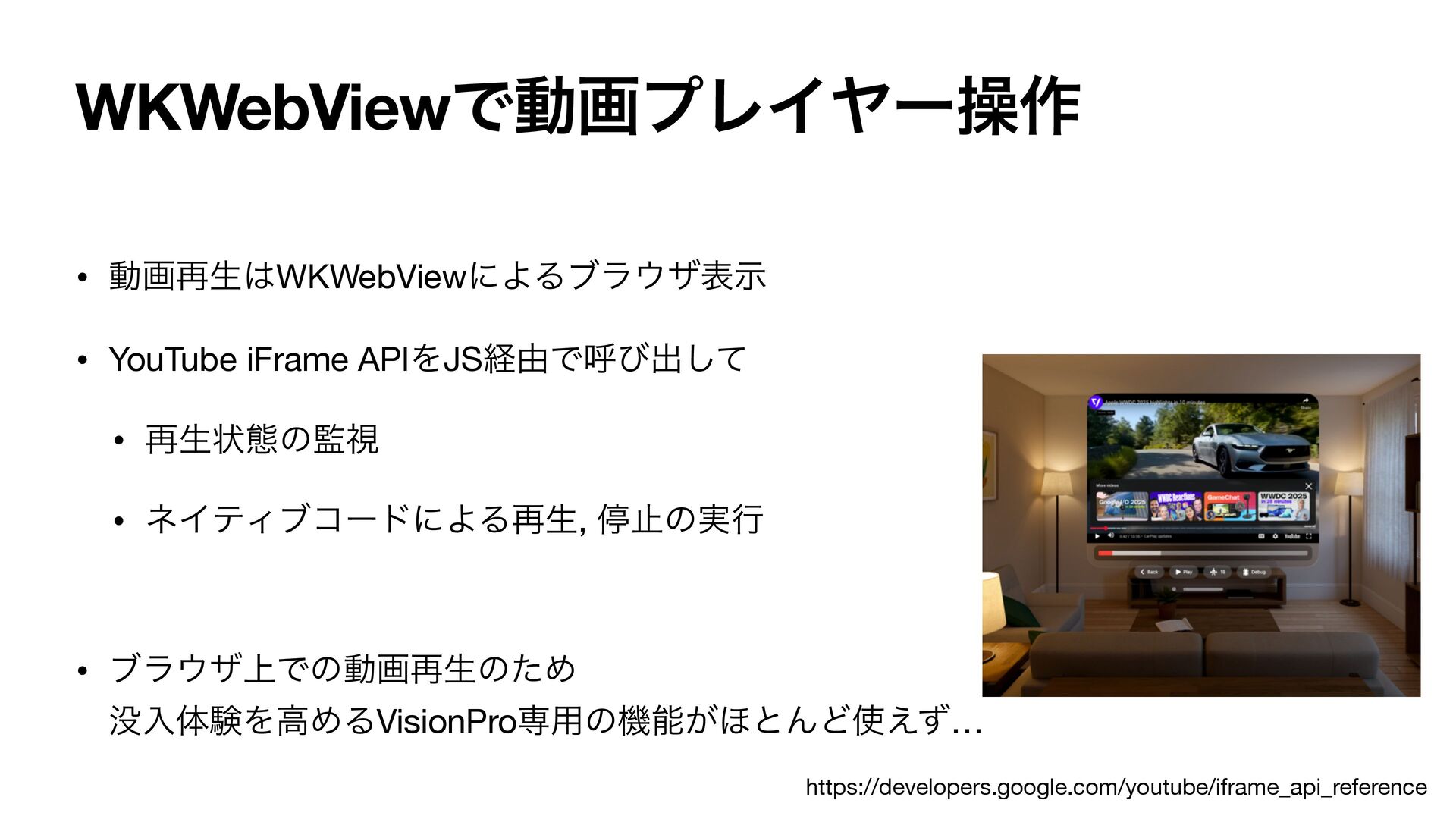 ωΠςΟϒίʔυʹΑΔ࠶ੜ, ఀࢭͷ࣮ߦ • ϒϥβ্Ͱͷಈը࠶ੜͷͨΊ ೖମݧΛߴΊΔVisionProઐ༻ͷػೳ͕΄ͱΜͲ͑ͣ… https://developers.google.com/youtube/iframe_api_reference