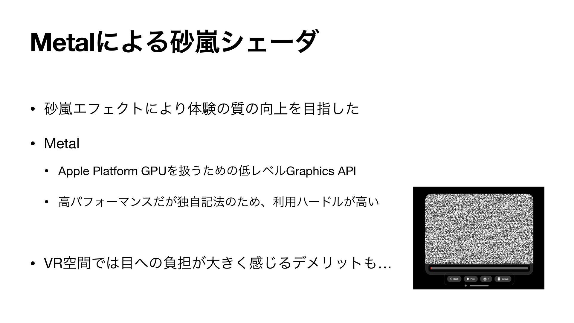 MetalʹΑΔ࠭ཛྷγΣʔμ • ࠭ཛྷΤϑΣΫτʹΑΓମݧͷ࣭ͷ্Λࢦͨ͠ • Metal • Apple Platform GPUΛѻ͏ͨΊͷϨϕϧGraphics API