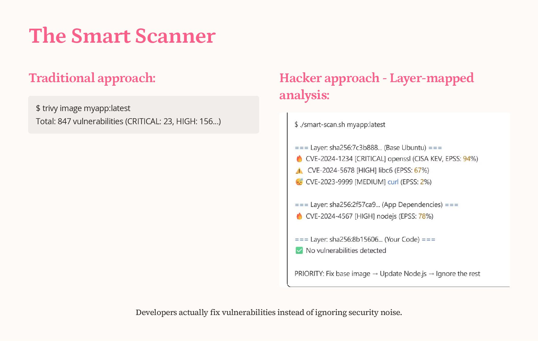 (CRITICAL: 23, HIGH: 156...) Traditional approach: Hacker approach - Layer-mapped analysis: Developers actually fix vulnerabilities instead of ignoring security noise.