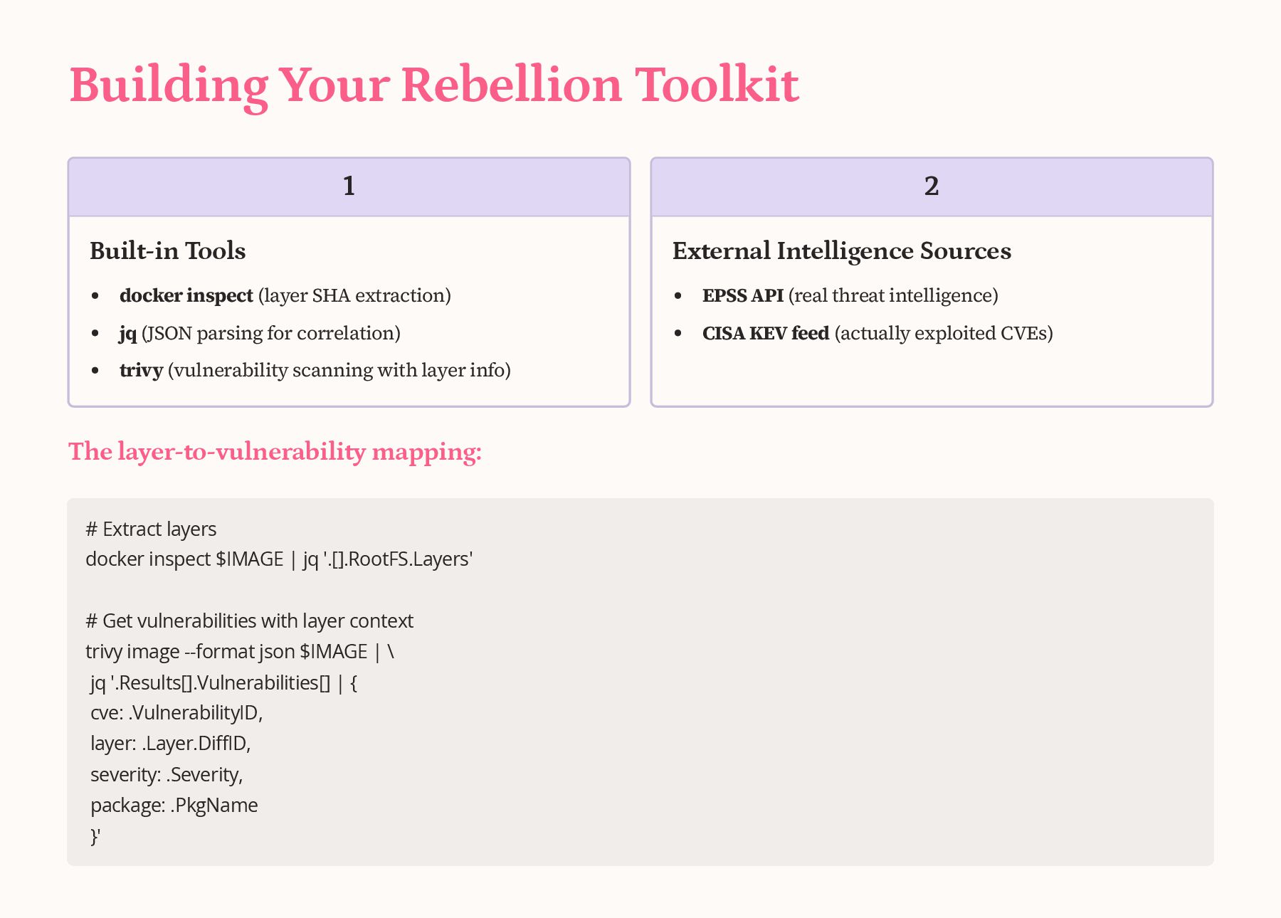 SHA extraction) jq (JSON parsing for correlation) trivy (vulnerability scanning with layer info) 2 External Intelligence Sources EPSS API (real threat intelligence) CISA KEV feed (actually exploited CVEs) The layer-to-vulnerability mapping: # Extract layers docker inspect $IMAGE | jq '.[].RootFS.Layers' # Get vulnerabilities with layer context trivy image --format json $IMAGE | \ jq '.Results[].Vulnerabilities[] | { cve: .VulnerabilityID, layer: .Layer.DiffID, severity: .Severity, package: .PkgName }'