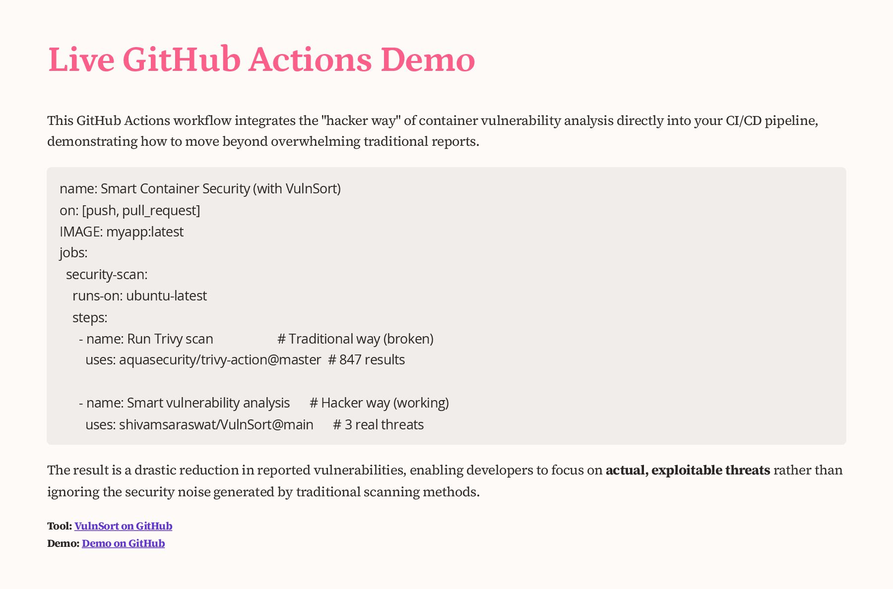 "hacker way" of container vulnerability analysis directly into your CI/CD pipeline, demonstrating how to move beyond overwhelming traditional reports. name: Smart Container Security (with VulnSort) on: [push, pull_request] IMAGE: myapp:latest jobs: security-scan: runs-on: ubuntu-latest steps: - name: Run Trivy scan # Traditional way (broken) uses: aquasecurity/trivy-action@master # 847 results - name: Smart vulnerability analysis # Hacker way (working) uses: shivamsaraswat/VulnSort@main # 3 real threats The result is a drastic reduction in reported vulnerabilities, enabling developers to focus on actual, exploitable threats rather than ignoring the security noise generated by traditional scanning methods. Tool: VulnSort on GitHub Demo: Demo on GitHub