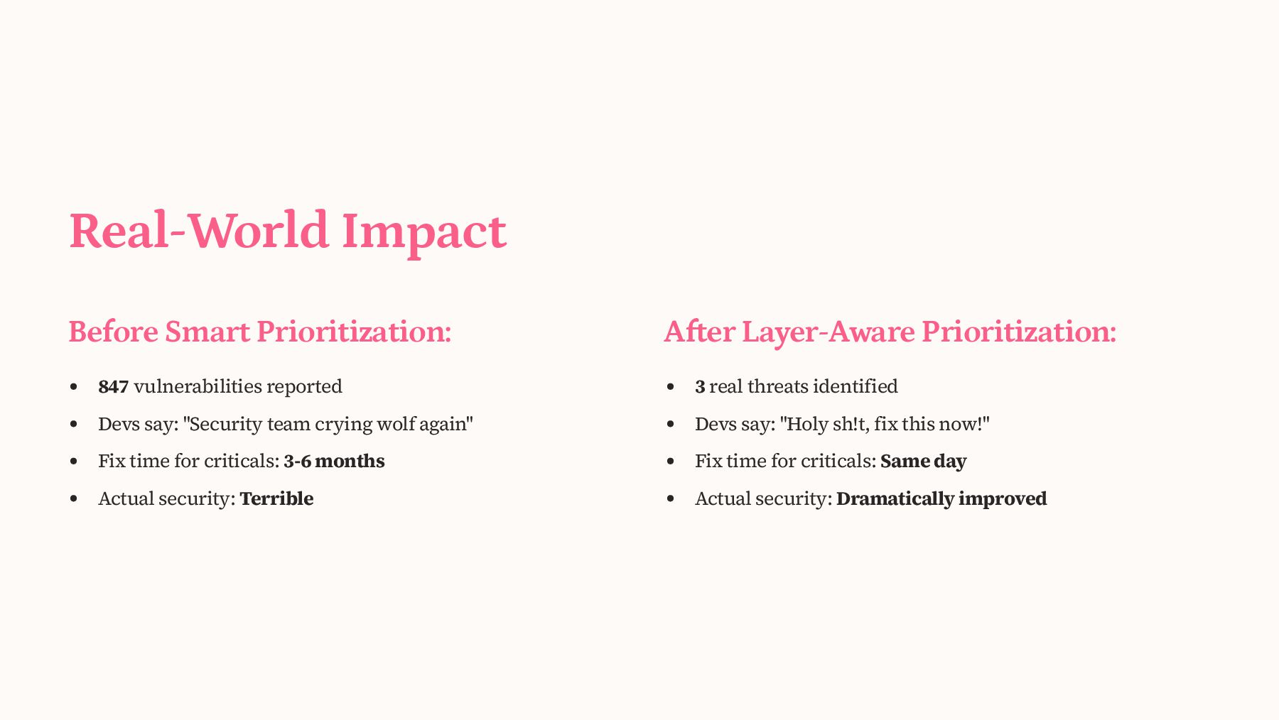 "Security team crying wolf again" Fix time for criticals: 3-6 months Actual security: Terrible After Layer-Aware Prioritization: 3 real threats identified Devs say: "Holy sh!t, fix this now!" Fix time for criticals: Same day Actual security: Dramatically improved