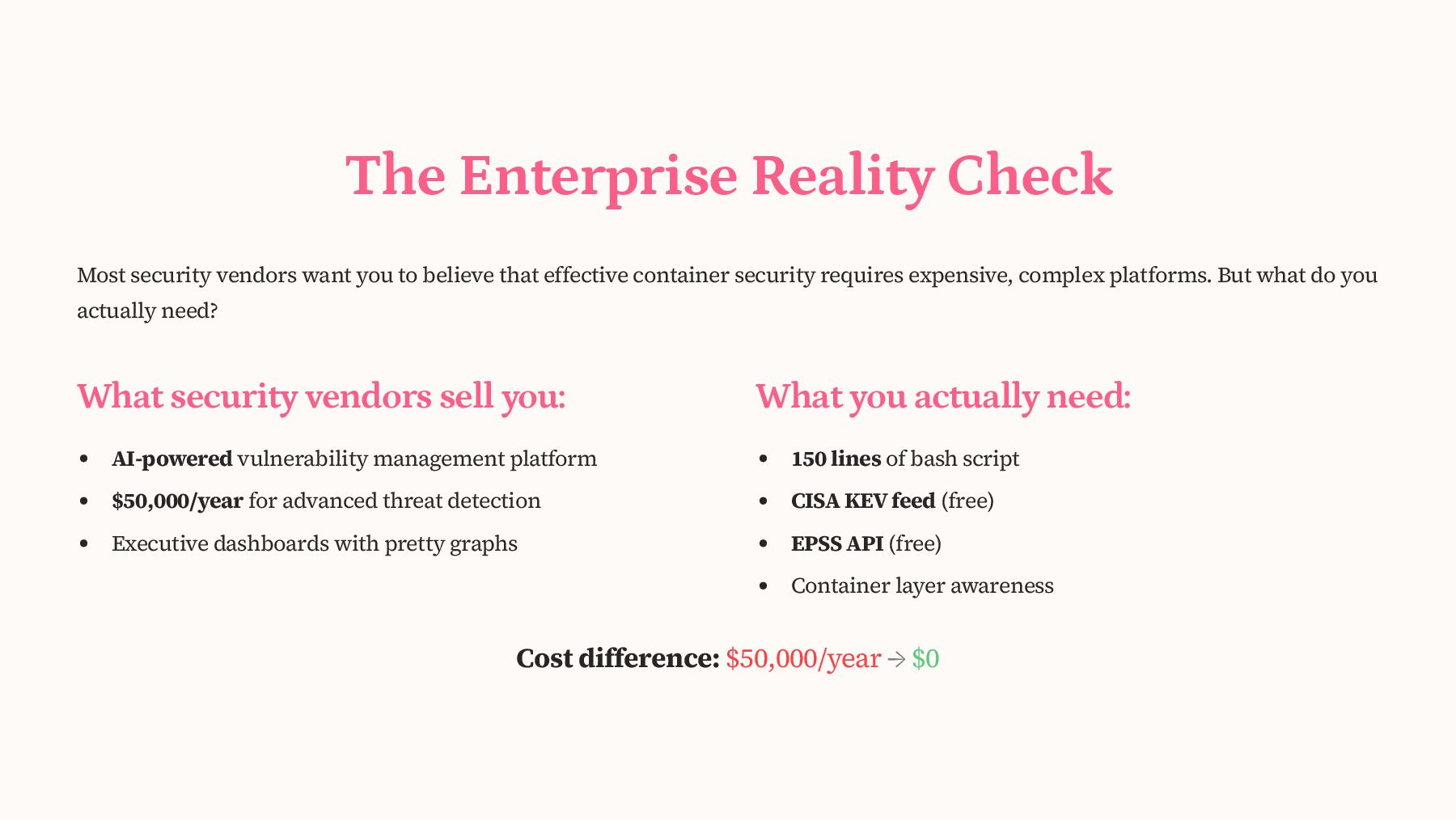 believe that effective container security requires expensive, complex platforms. But what do you actually need? What security vendors sell you: AI-powered vulnerability management platform $50,000/year for advanced threat detection Executive dashboards with pretty graphs What you actually need: 150 lines of bash script CISA KEV feed (free) EPSS API (free) Container layer awareness Cost difference: $50,000/year ³ $0