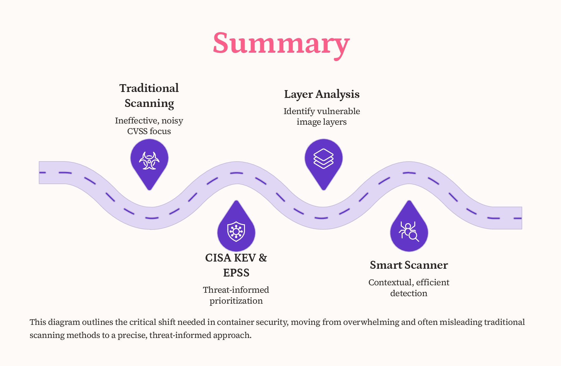 EPSS Threat-informed prioritization Layer Analysis Identify vulnerable image layers Smart Scanner Contextual, efficient detection This diagram outlines the critical shift needed in container security, moving from overwhelming and often misleading traditional scanning methods to a precise, threat-informed approach.