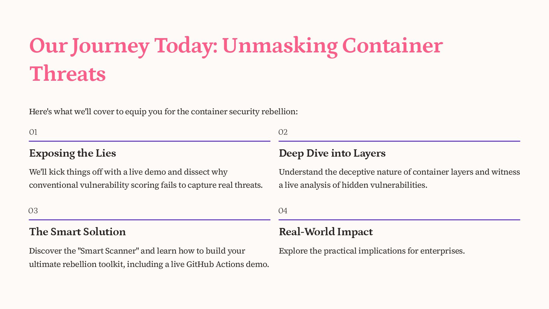 to equip you for the container security rebellion: 01 Exposing the Lies We'll kick things off with a live demo and dissect why conventional vulnerability scoring fails to capture real threats. 02 Deep Dive into Layers Understand the deceptive nature of container layers and witness a live analysis of hidden vulnerabilities. 03 The Smart Solution Discover the "Smart Scanner" and learn how to build your ultimate rebellion toolkit, including a live GitHub Actions demo. 04 Real-World Impact Explore the practical implications for enterprises.