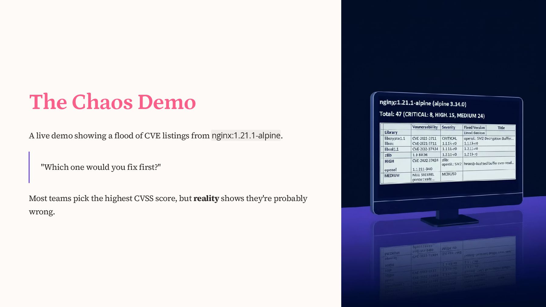 CVE listings from nginx:1.21.1-alpine. "Which one would you fix first?" Most teams pick the highest CVSS score, but reality shows they're probably wrong.