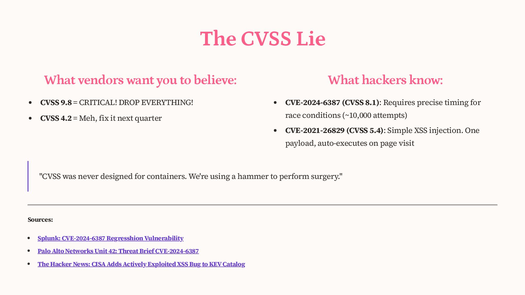 9.8 = CRITICAL! DROP EVERYTHING! CVSS 4.2 = Meh, fix it next quarter What hackers know: CVE-2024-6387 (CVSS 8.1): Requires precise timing for race conditions (~10,000 attempts) CVE-2021-26829 (CVSS 5.4): Simple XSS injection. One payload, auto-executes on page visit "CVSS was never designed for containers. We're using a hammer to perform surgery." Sources: Splunk: CVE-2024-6387 Regresshion Vulnerability Palo Alto Networks Unit 42: Threat Brief CVE-2024-6387 The Hacker News: CISA Adds Actively Exploited XSS Bug to KEV Catalog