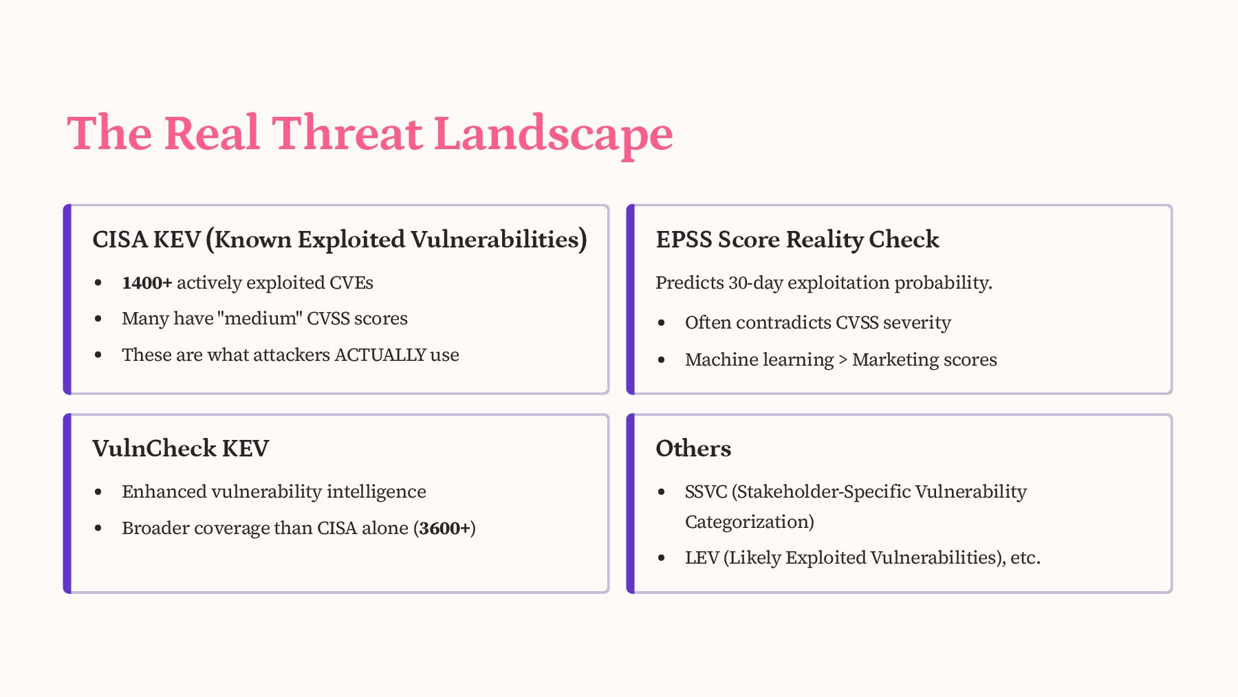 actively exploited CVEs Many have "medium" CVSS scores These are what attackers ACTUALLY use EPSS Score Reality Check Predicts 30-day exploitation probability. Often contradicts CVSS severity Machine learning > Marketing scores VulnCheck KEV Enhanced vulnerability intelligence Broader coverage than CISA alone (3600+) Others SSVC (Stakeholder-Specific Vulnerability Categorization) LEV (Likely Exploited Vulnerabilities), etc.