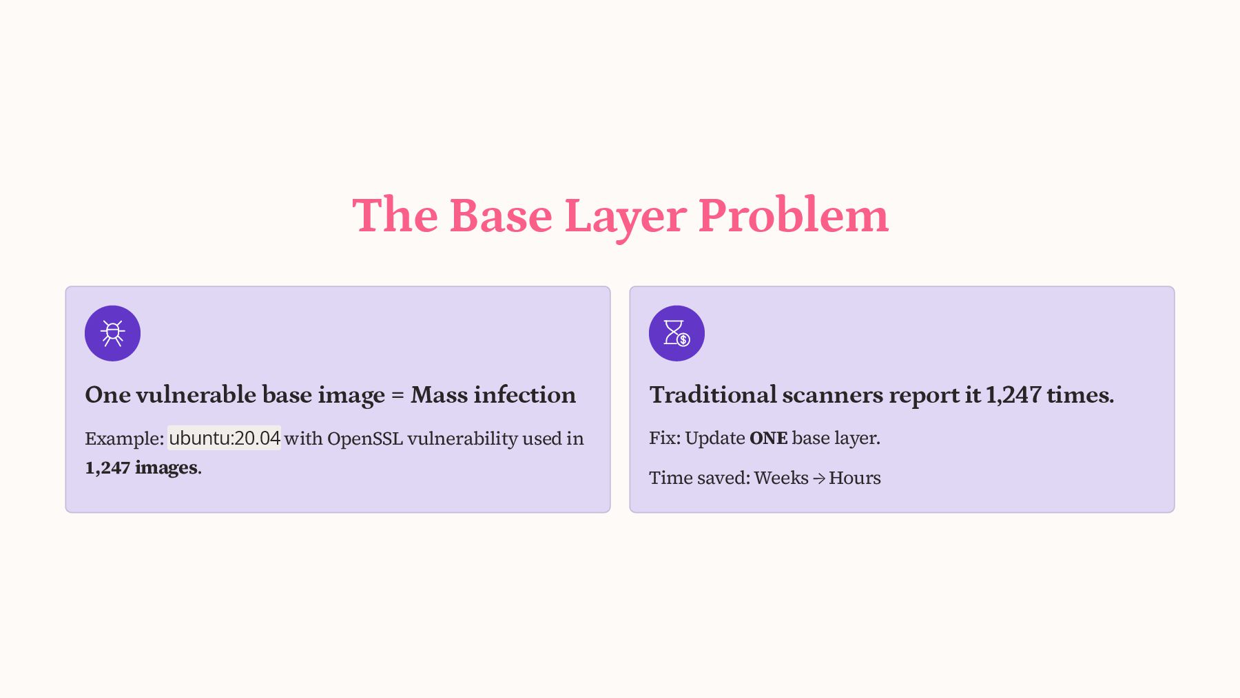 infection Example: ubuntu:20.04 with OpenSSL vulnerability used in 1,247 images. Traditional scanners report it 1,247 times. Fix: Update ONE base layer. Time saved: Weeks ³ Hours